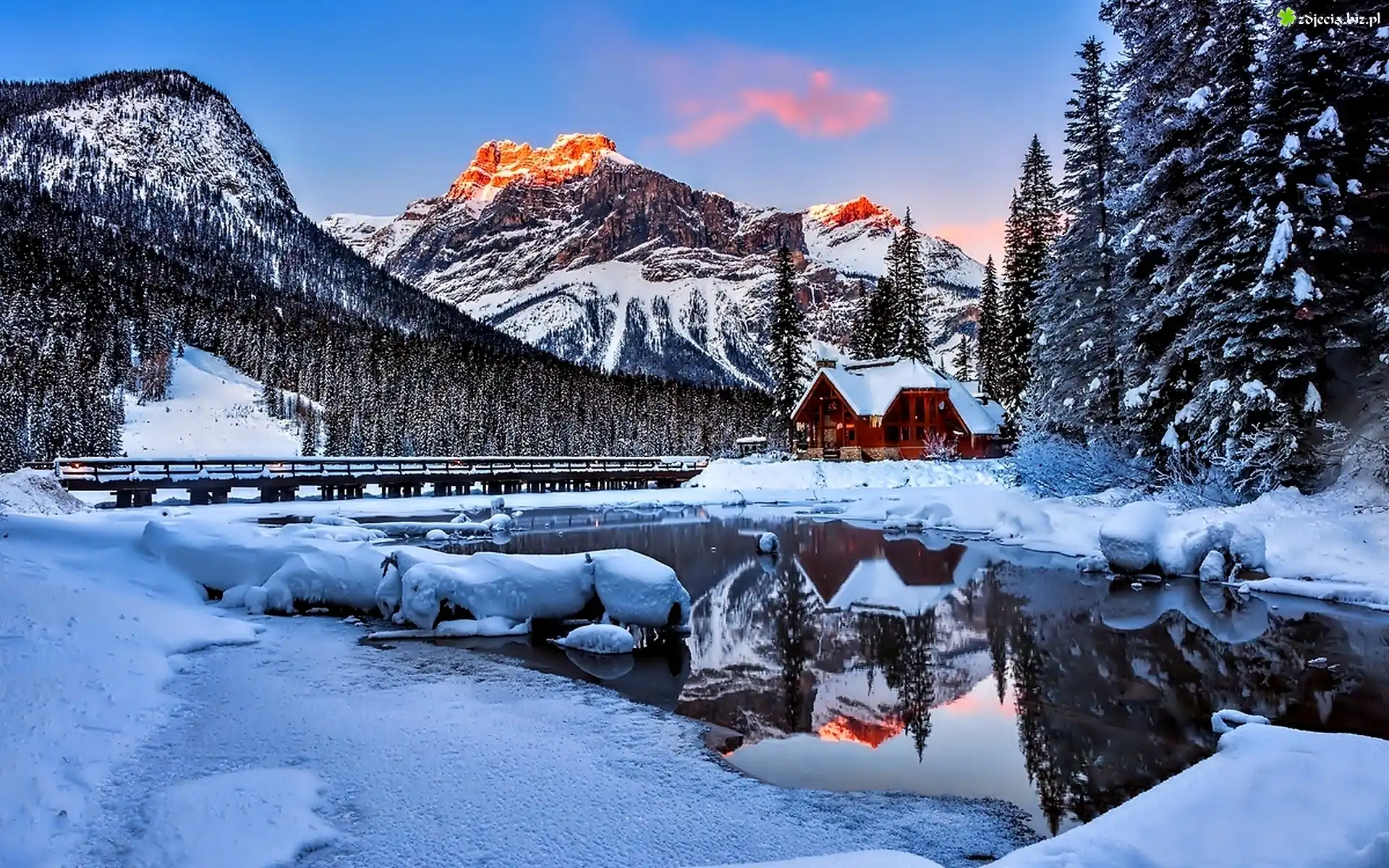 Zdjęcie Zima, Śnieg, Góry, Las, Rzeka, Most, Dom
