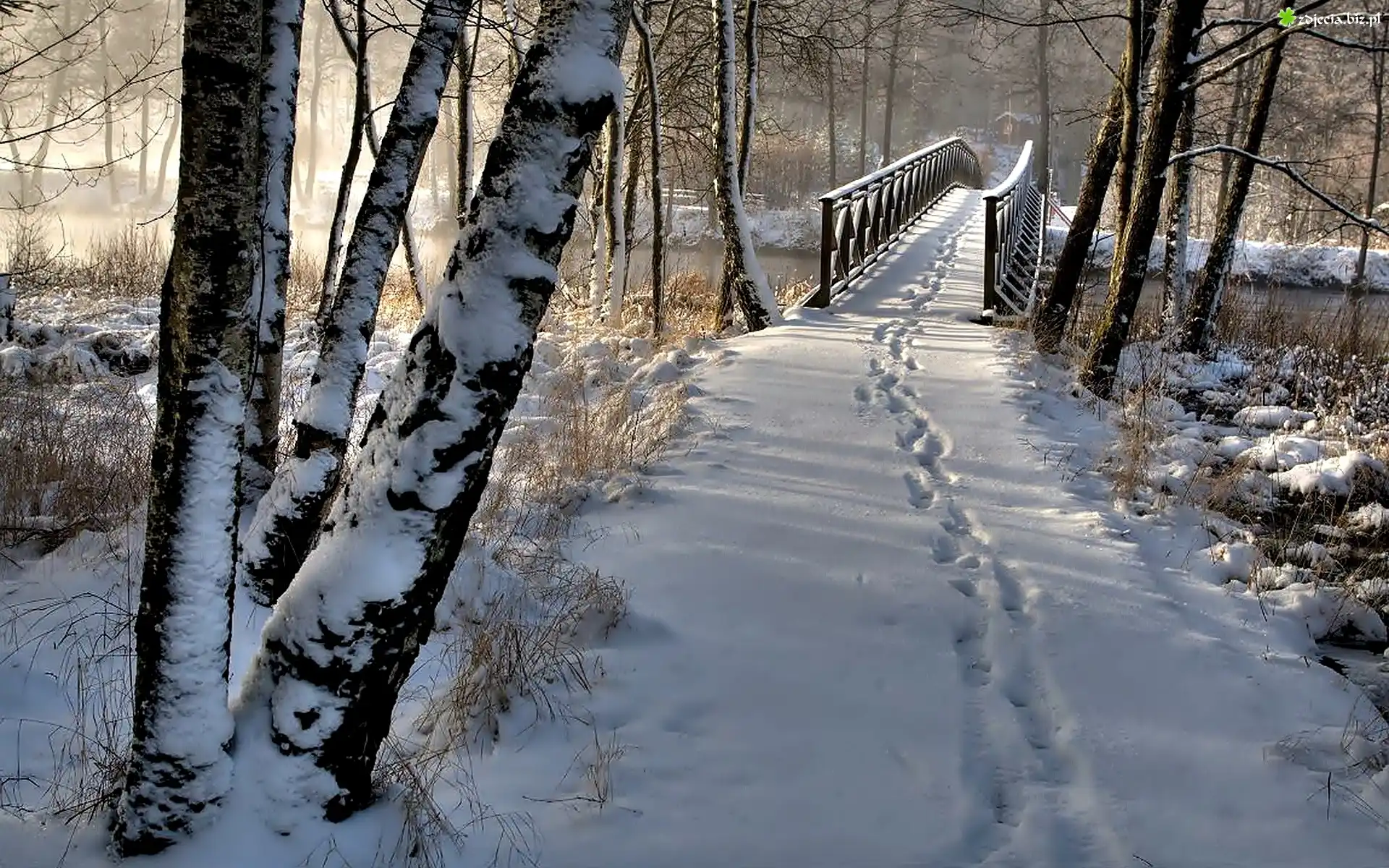 Zdjęcie Zima, Śnieg, Park, Drzewa, Drewniany, Most, Ślady