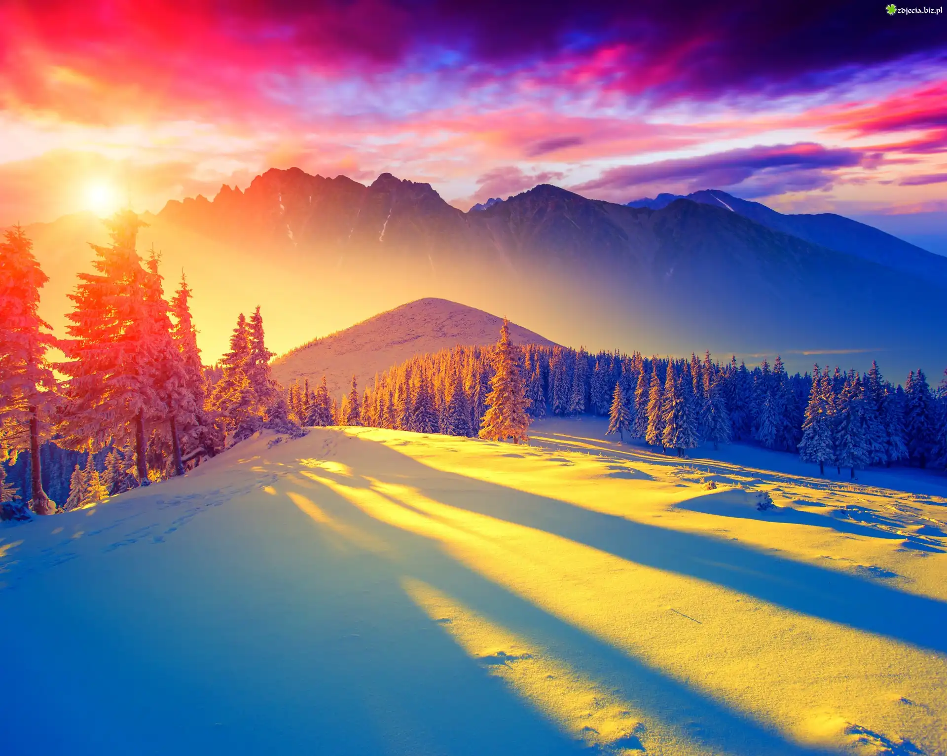 Zdjęcie Zima, Śnieg, Góry, Promienie, Blask, Zachód słońca