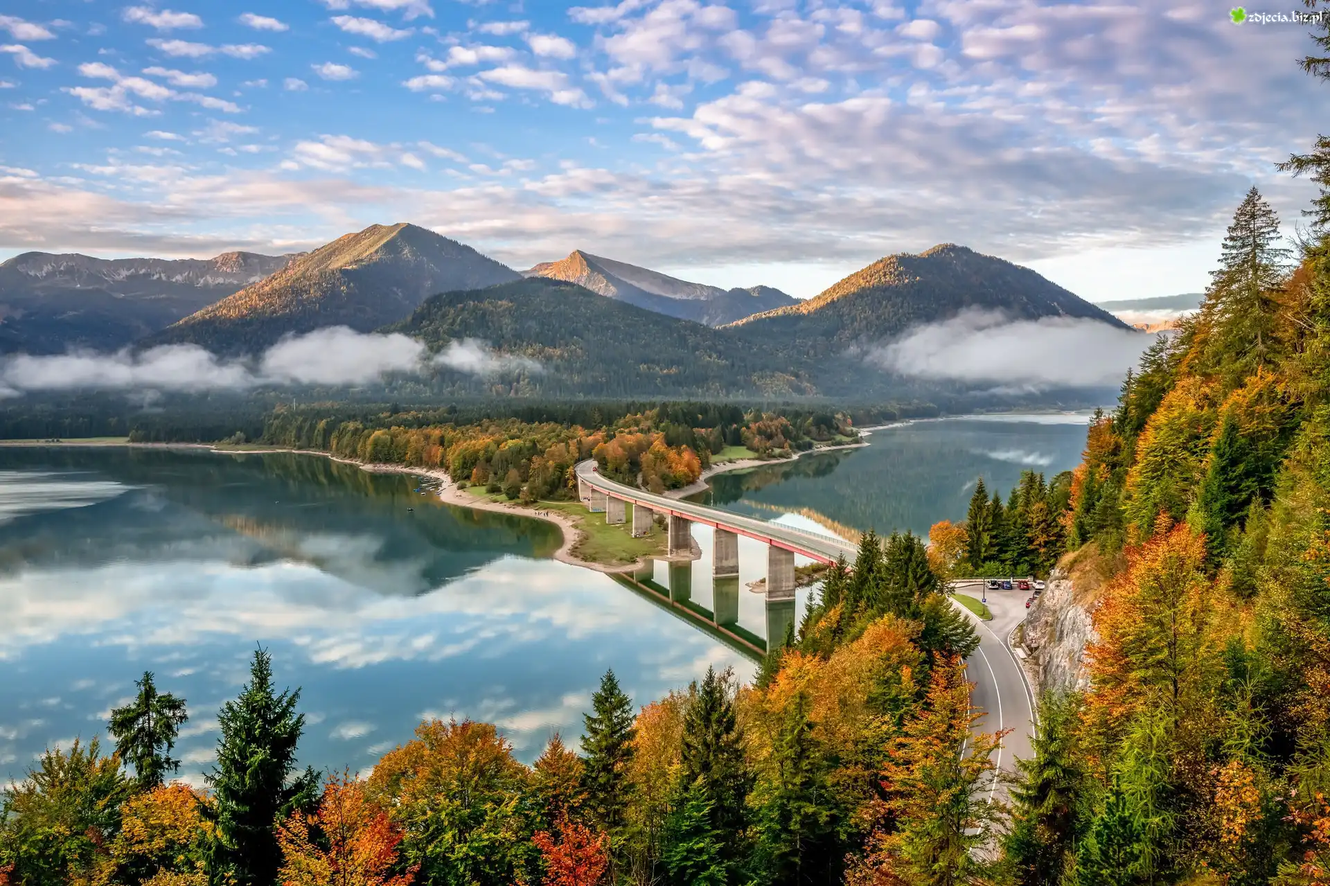 Zdjęcie Niemcy, Bawaria, Góry Alpy, Jezioro Sylvenstein, Zbiornik retencyjny, Most, Las, Droga, Jesień, Chmury |