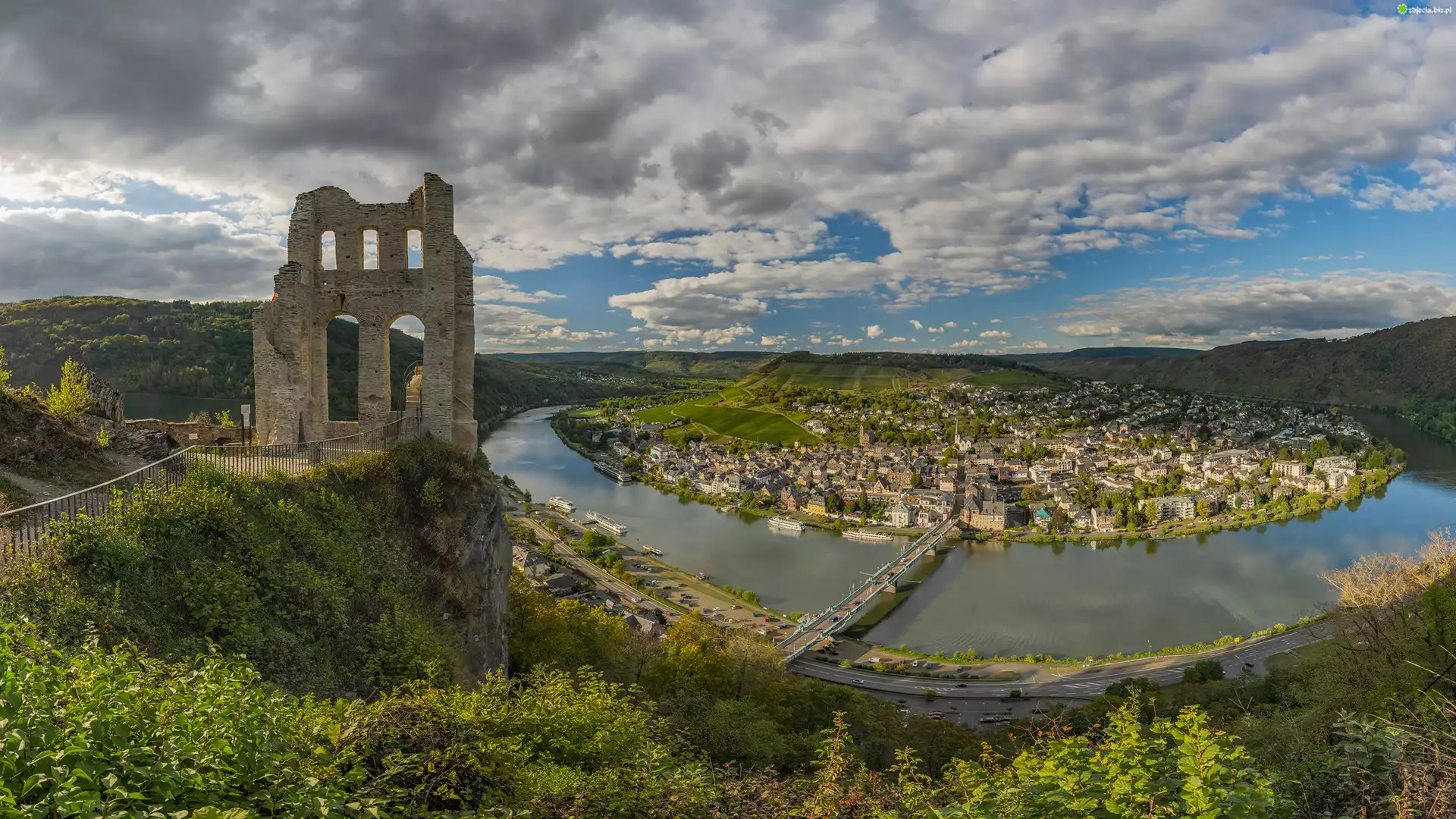 Zdjęcie, Niemcy, Traben Trarbach, Rzeka Mozela, Panorama, Domy, Ruiny, Chmury