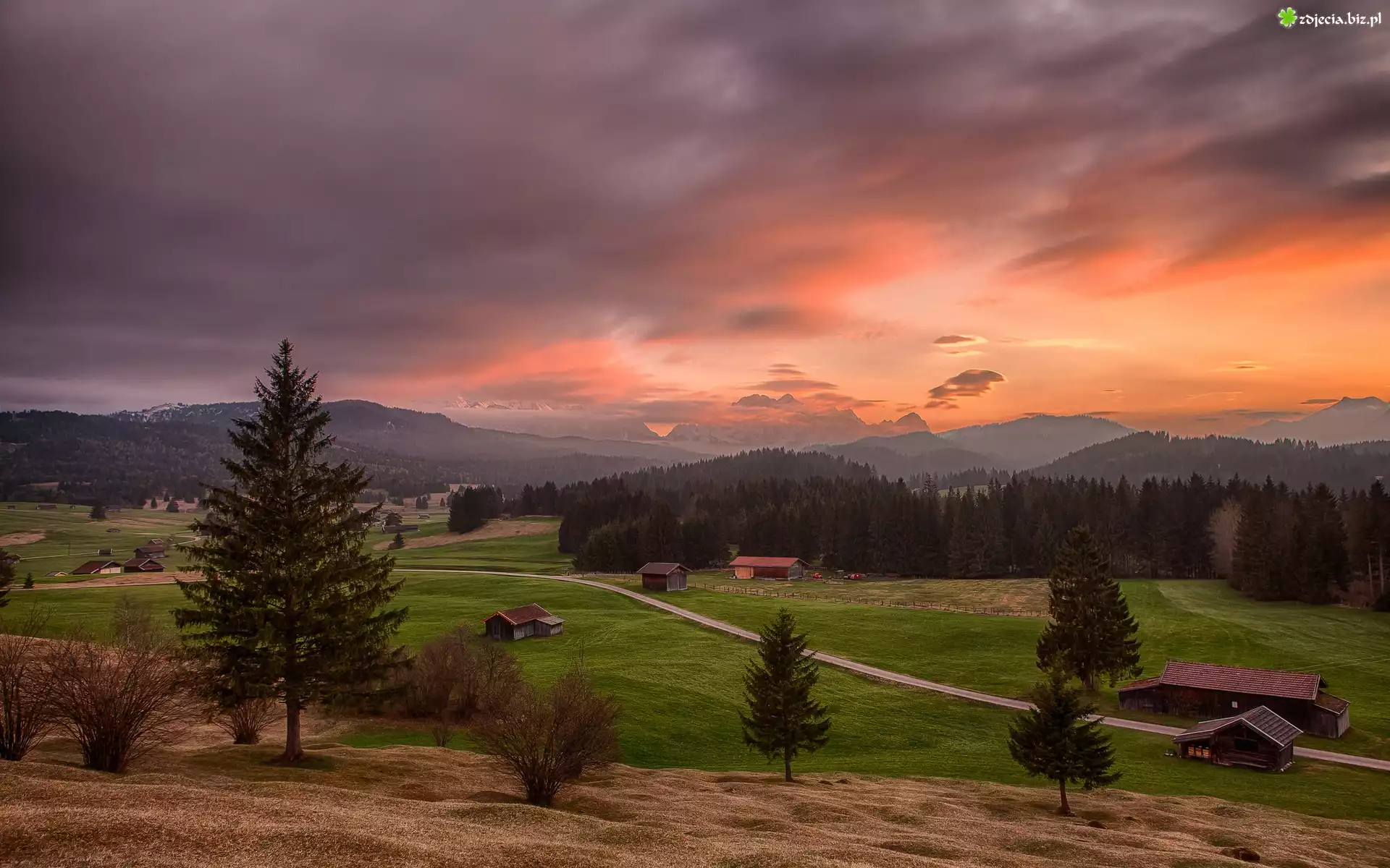 Zdjęcie Karwendel, Alpy, Lasy, Drogi, Domy, Zachód, Słońca, Bawaria, Niemcy