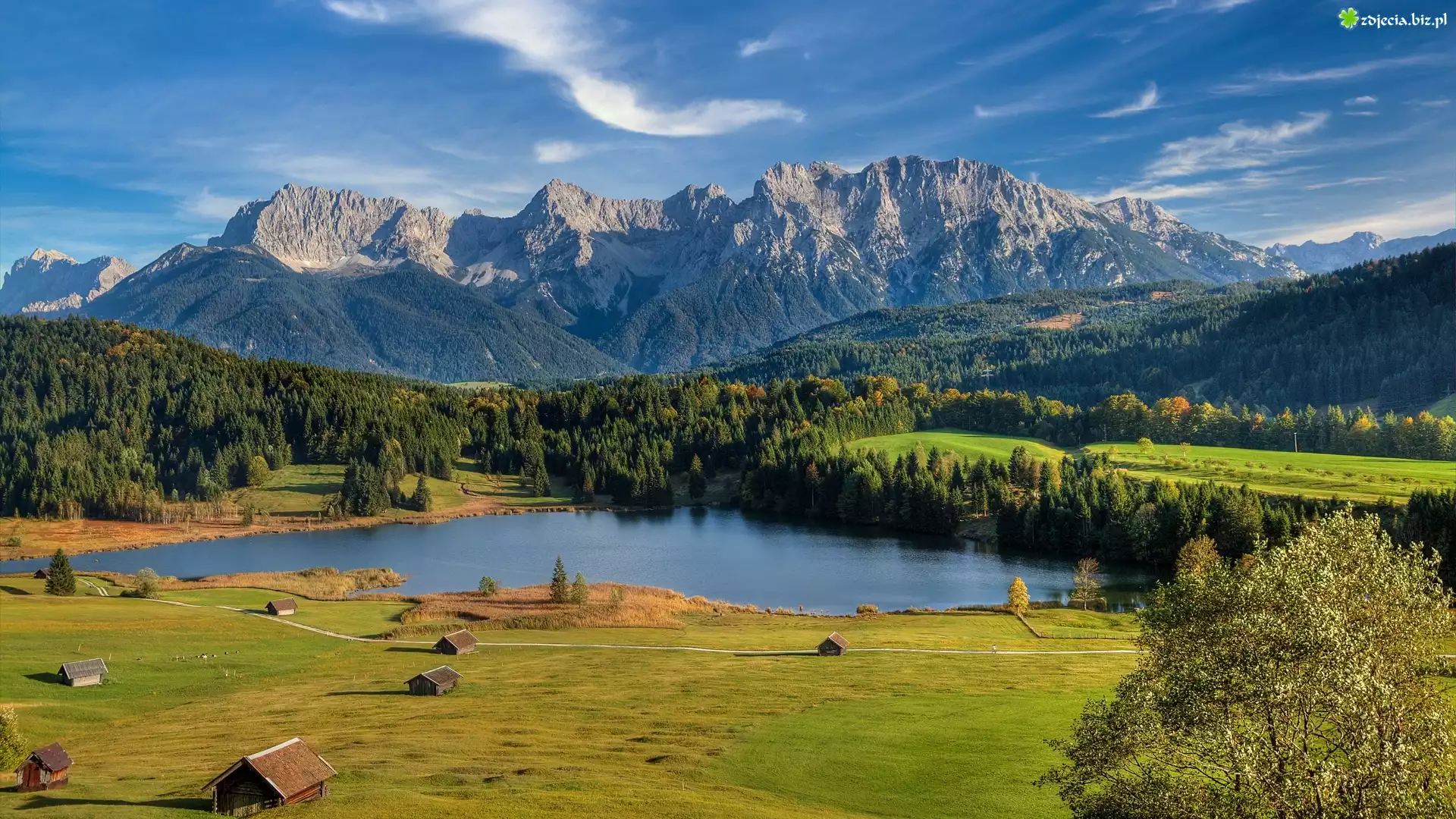 Zdjęcie Jezioro Geroldsee, Góry Alpy, Miejscowość Krun, Domki, Lasy, Bawaria, Niemcy