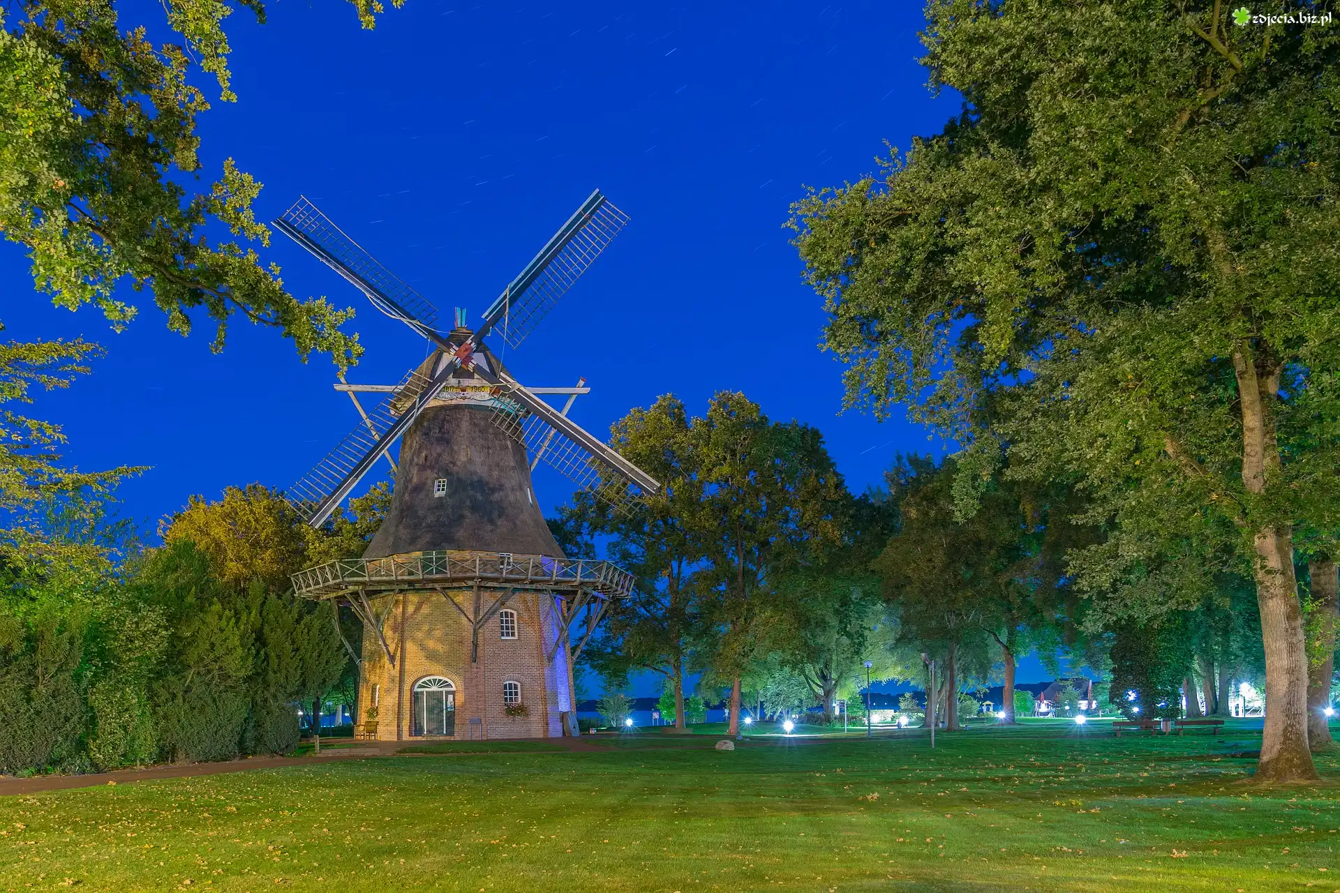 Zdjęcie, Wiatrak, Querensted Mill, Drzewa, Bad Zwischenahn, Dolna Saksonia, Niemcy