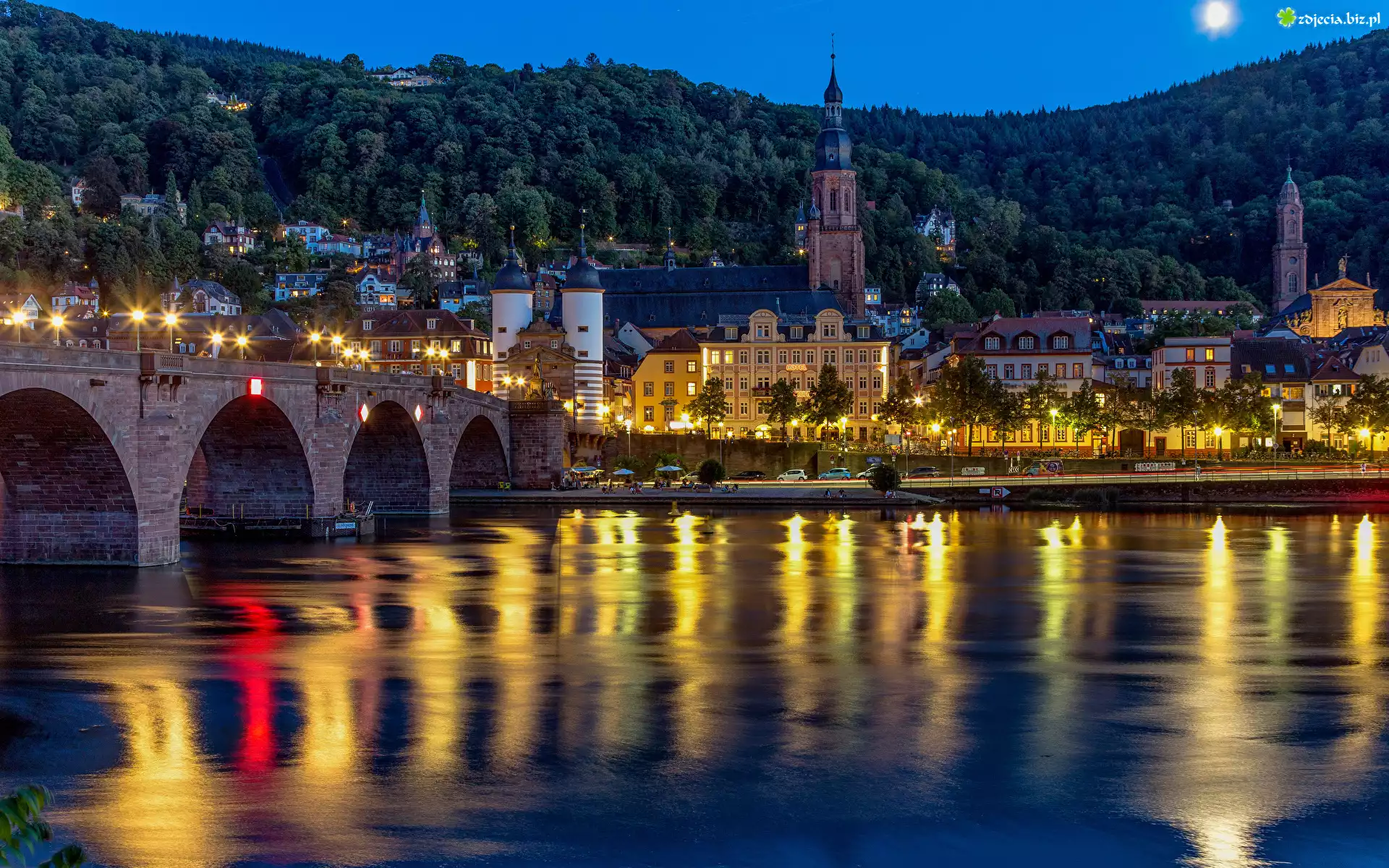 Zdjęcie Niemcy, Heidelberg, Most, Rzeka Neckar, Domy, Kościół, Światło, Noc, Odbicie