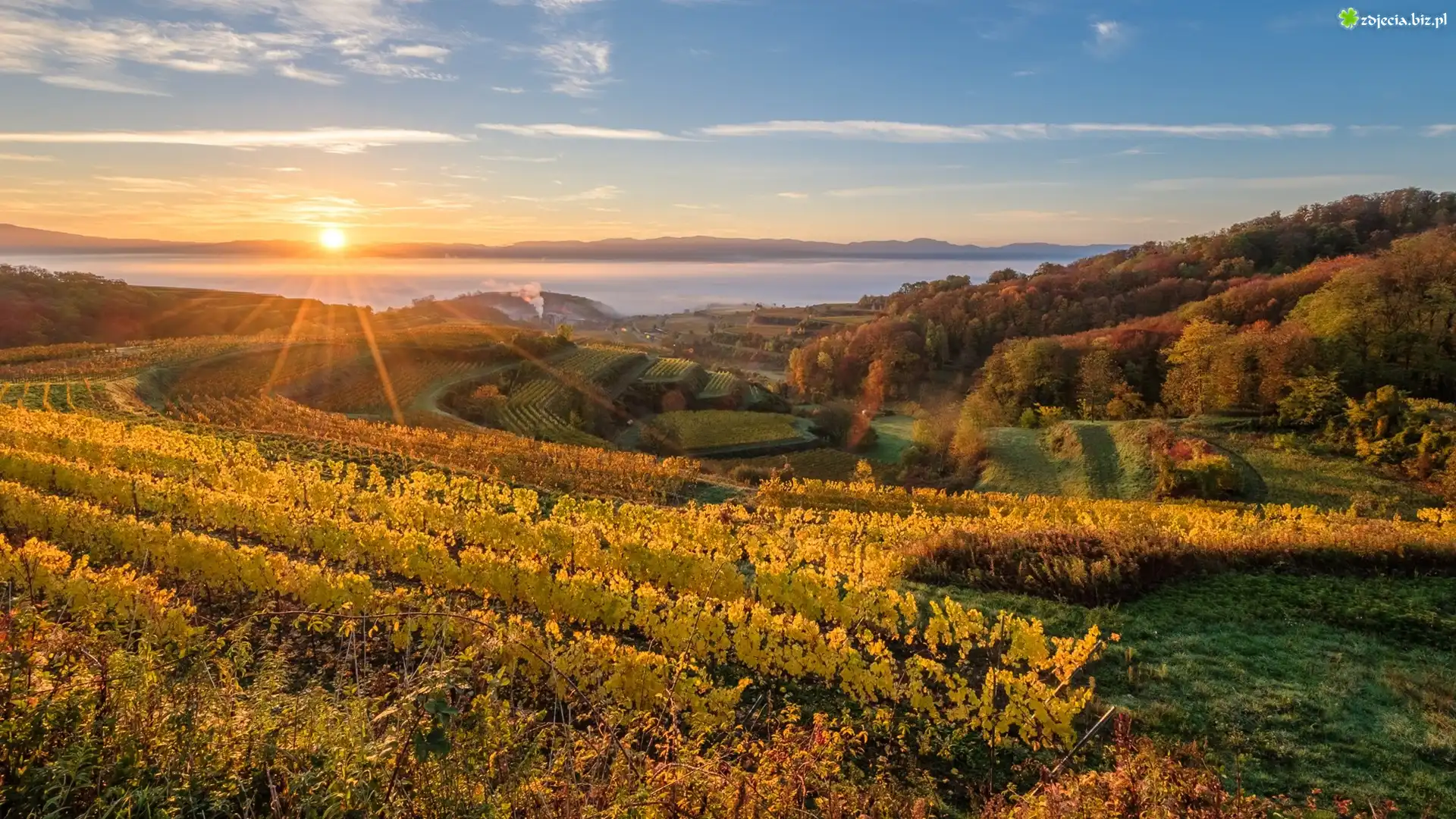 Zdjęcie, Wzgórza, Kaiserstuhl, Plantacja, Winnice, Wschód słońca, Badenia-Wirtembergia, Niemcy