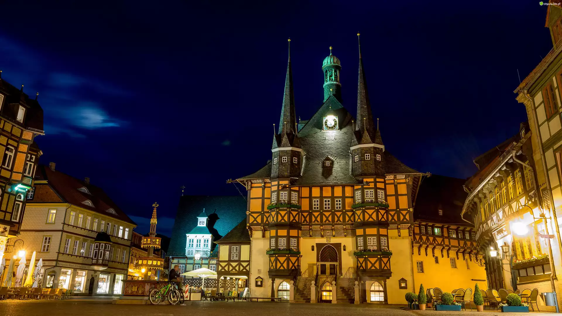 Zdjęcie, Rynek, Oświetlony, Ratusz, Domy, Noc, Wernigerode, Saksonia-Anhalt, Niemcy