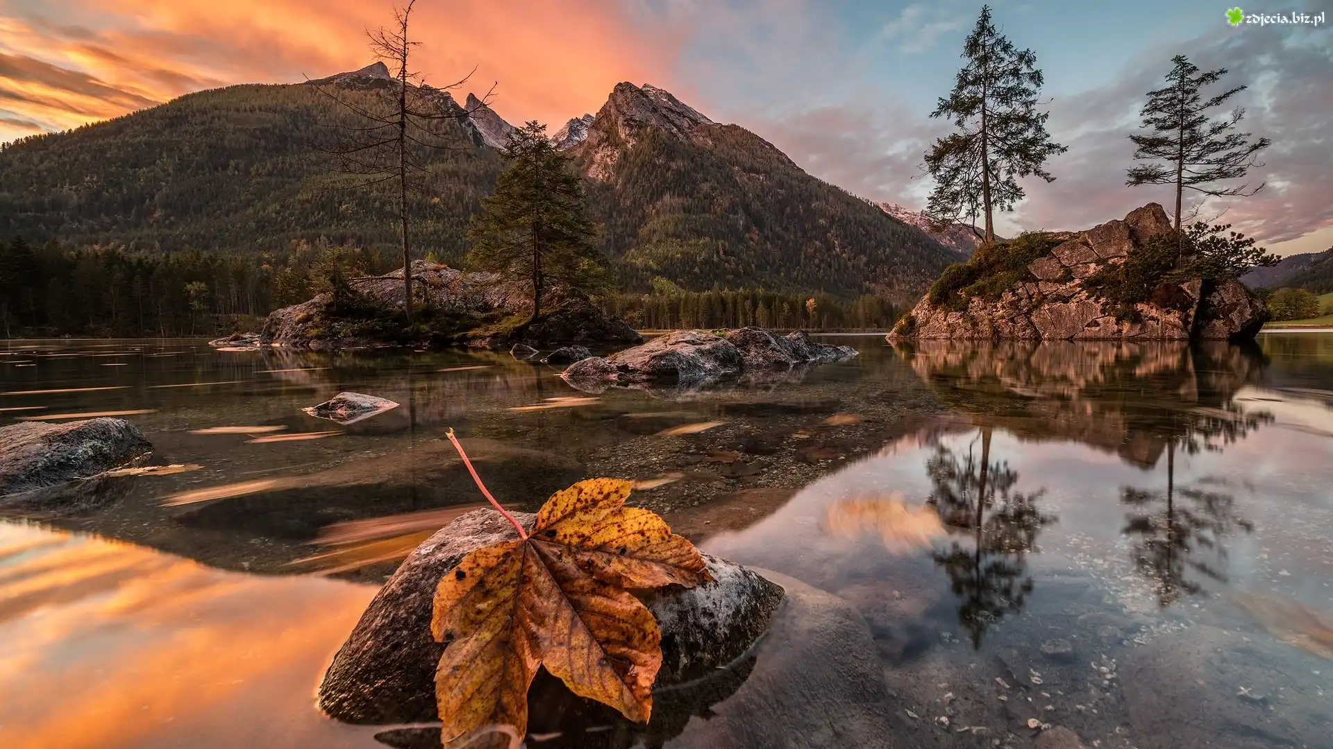 Zdjęcie Góry, Alpy, Jezioro Hintersee, Skały, Drzewa, Zachód słońca, Bawaria, Niemcy