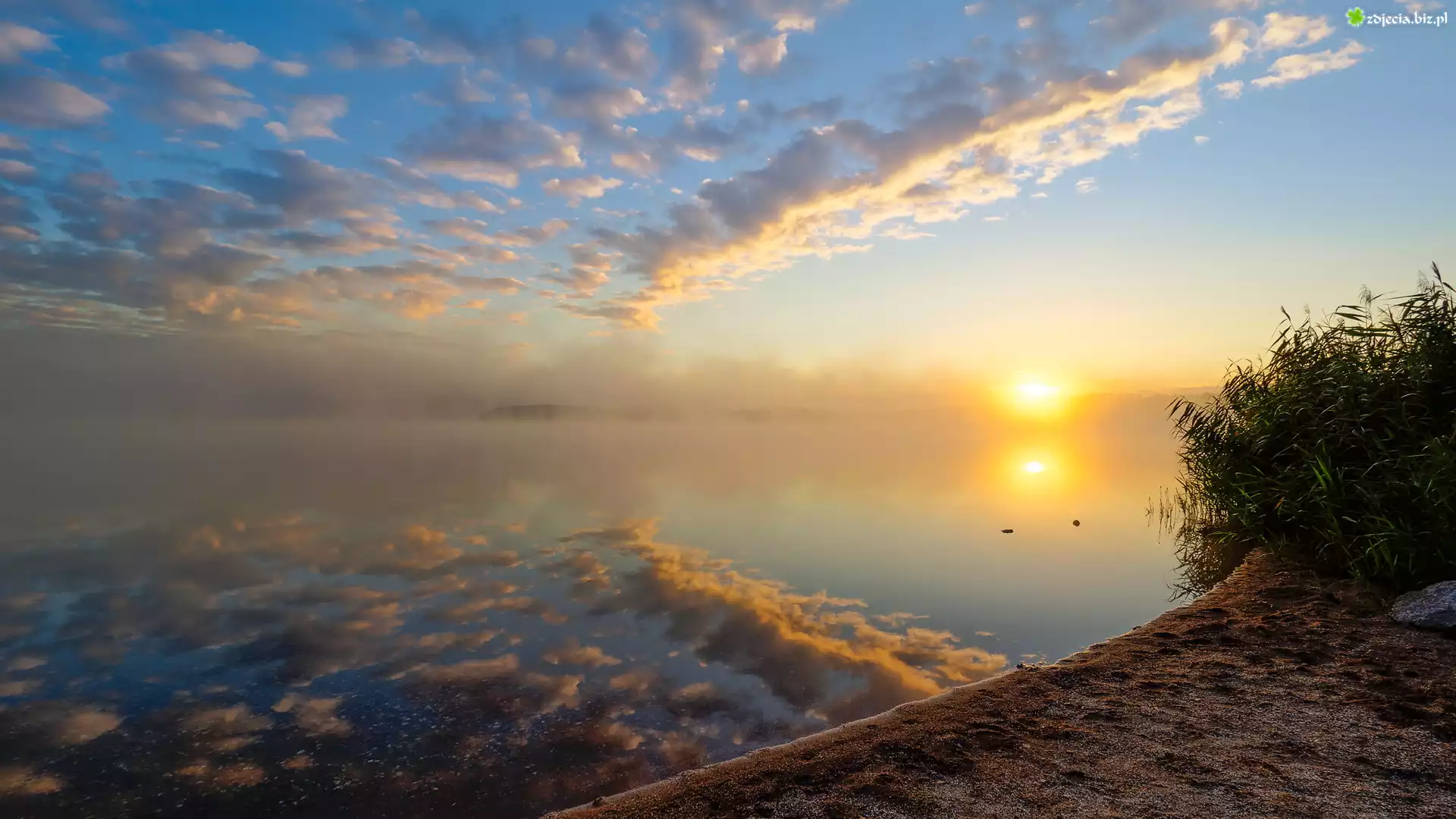 Zdjęcie Jezioro, Steinberger See, Wschód słońca, Mgła, Chmury, Trzciny, Bawaria, Niemcy