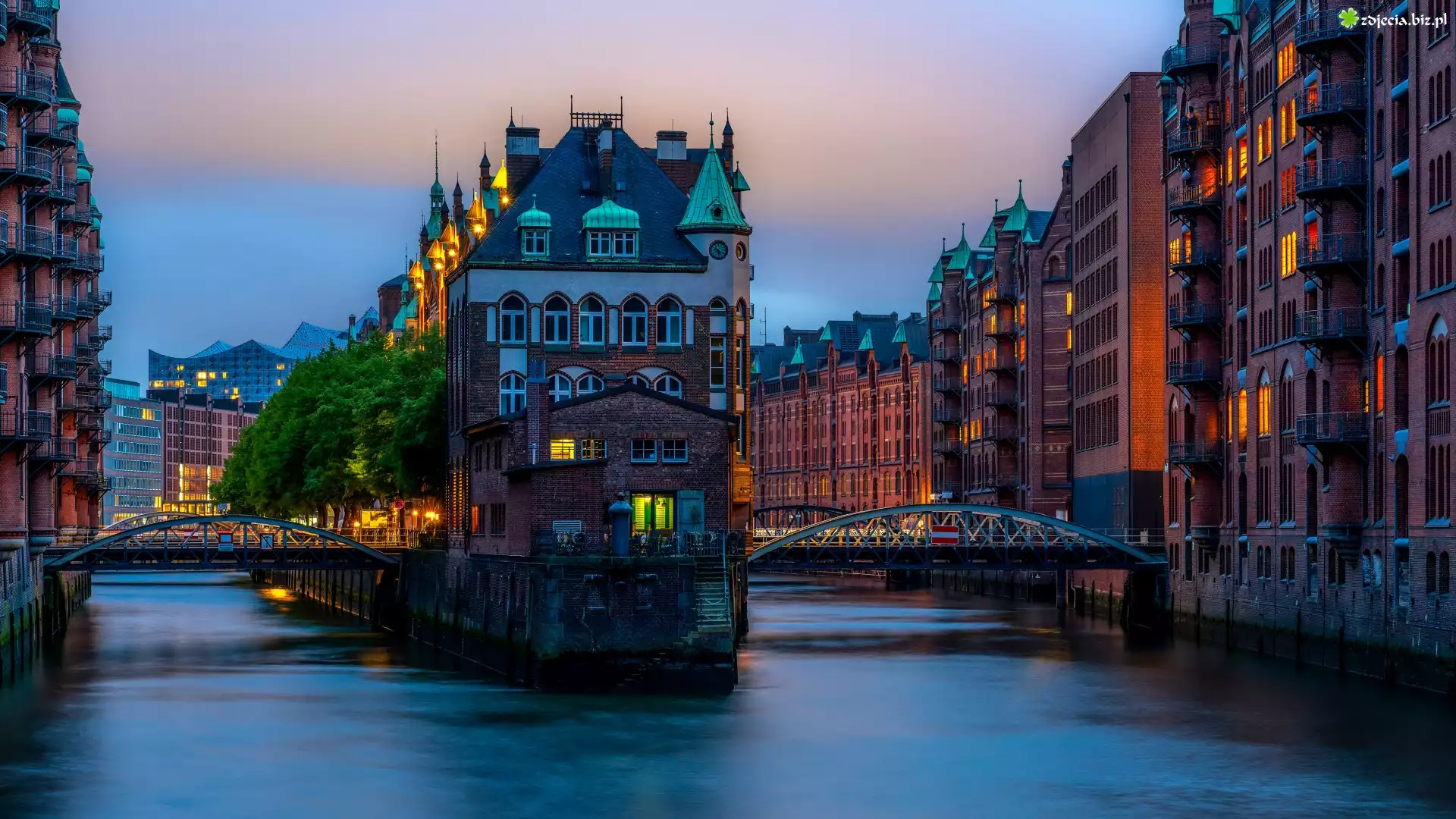 Zdjęcie Niemcy, Hamburg, Speicherstadt, Budynki, Kanały, Mosty, Światła, Drzewa, Zmierzch