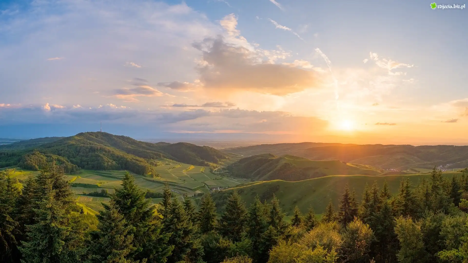 Zdjęcie Promienie słońca, Wzgórza, Pola, Drzewa, Las, Góry, Kaiserstuhl, Niemcy
