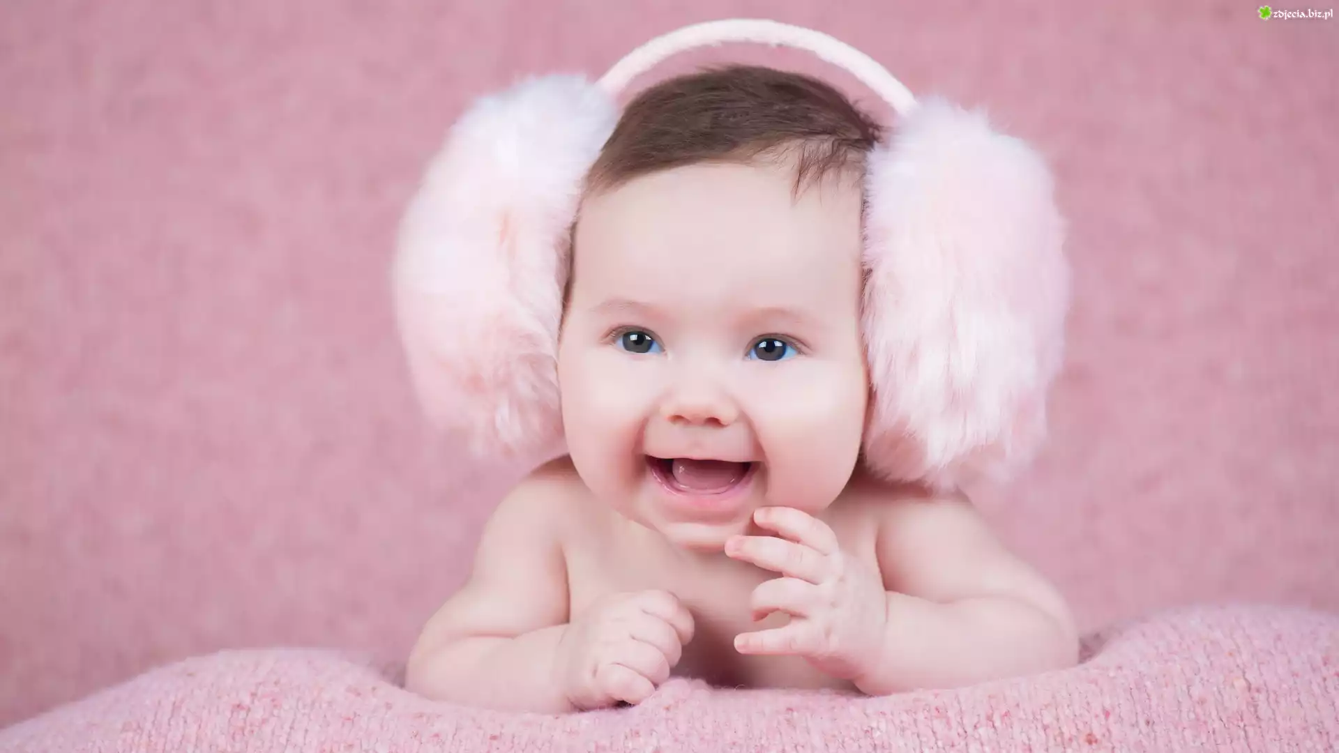Zdjęcie Niemowlę, Uśmiech, Nauszniki, Radość, Spojrzenie