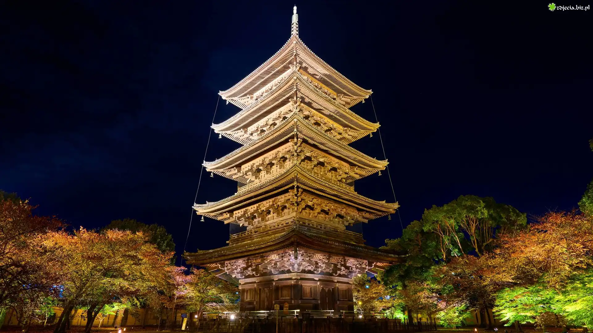 Zdjęcie, Japonia, Kioto, Świątynia, Tō-ji, Pagoda, Jesień, Drzewa, Noc