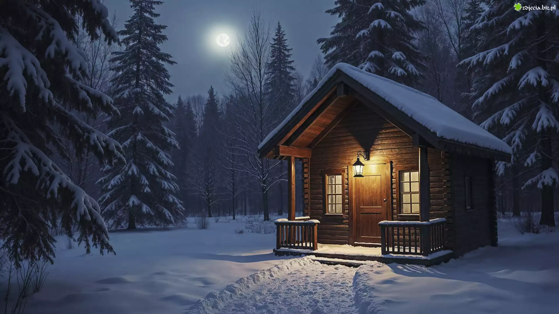 Zdjęcie Zima, Dom, Las, Noc, Księżyc, Drzewa