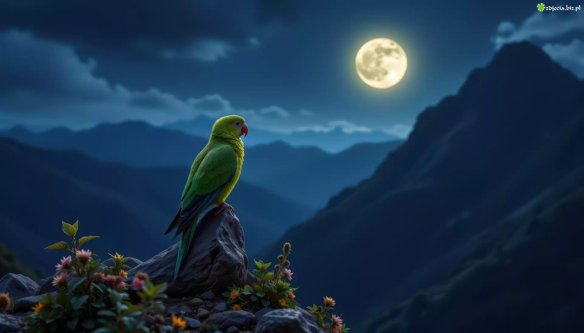 Zdjęcie Papuga, Kwiaty, Skała, Noc, Księżyc, Góry