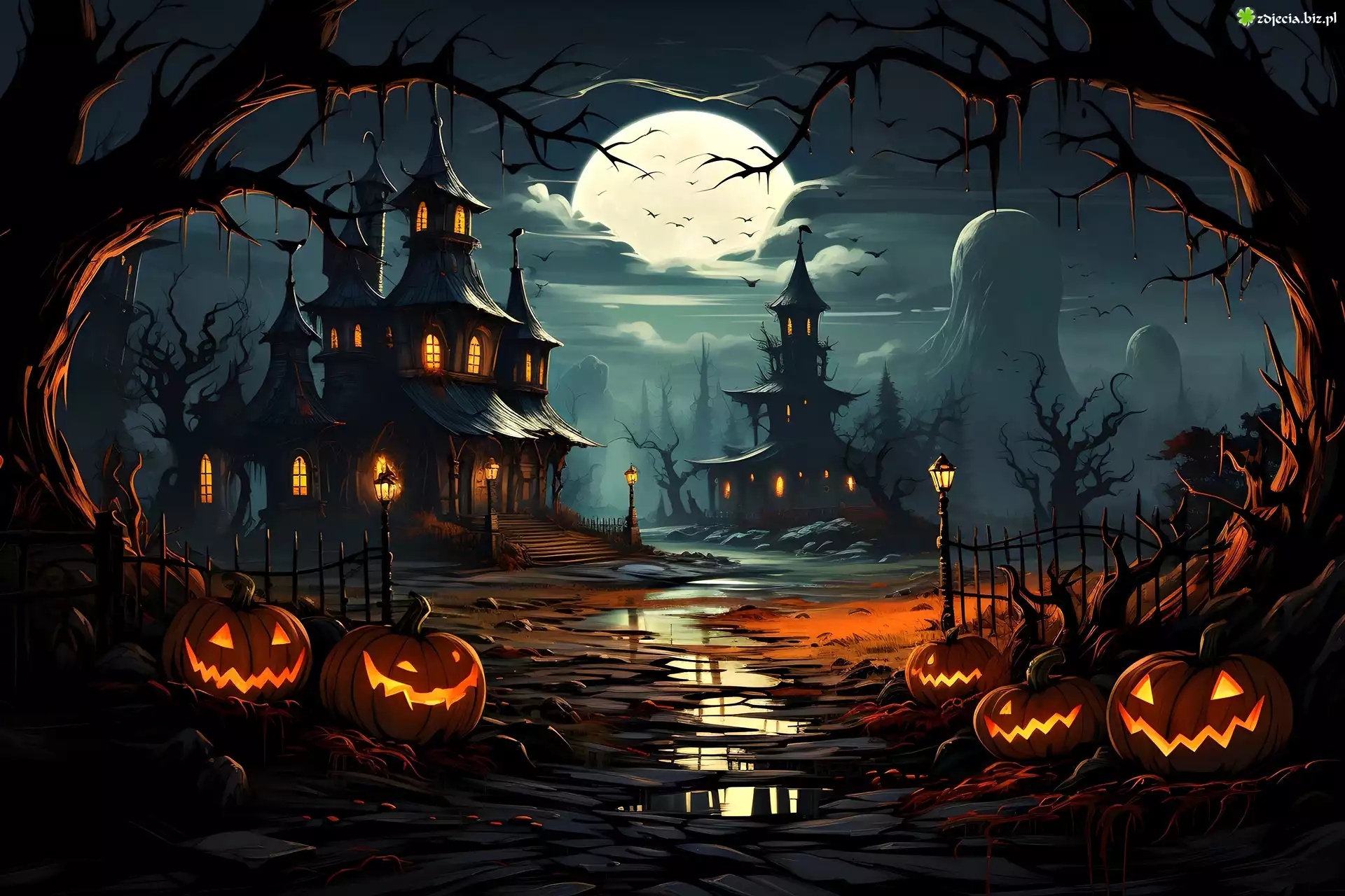 Zdjęcie Dynie, Drzewa, Zamki, Noc, Grafika, Halloween