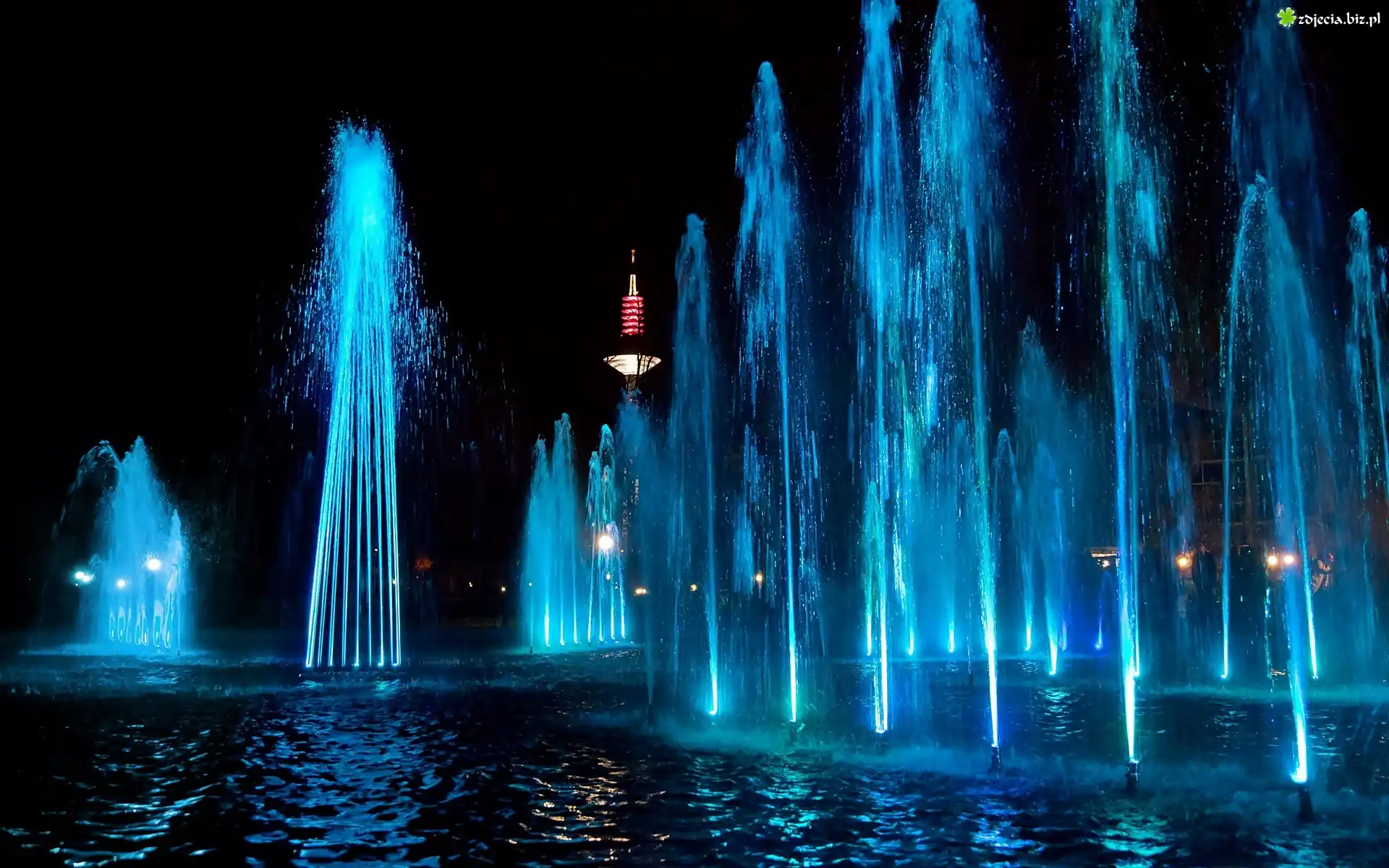 Zdjęcie Noc, Sadzawka, Podświetlone, Wodotryski, Budynek