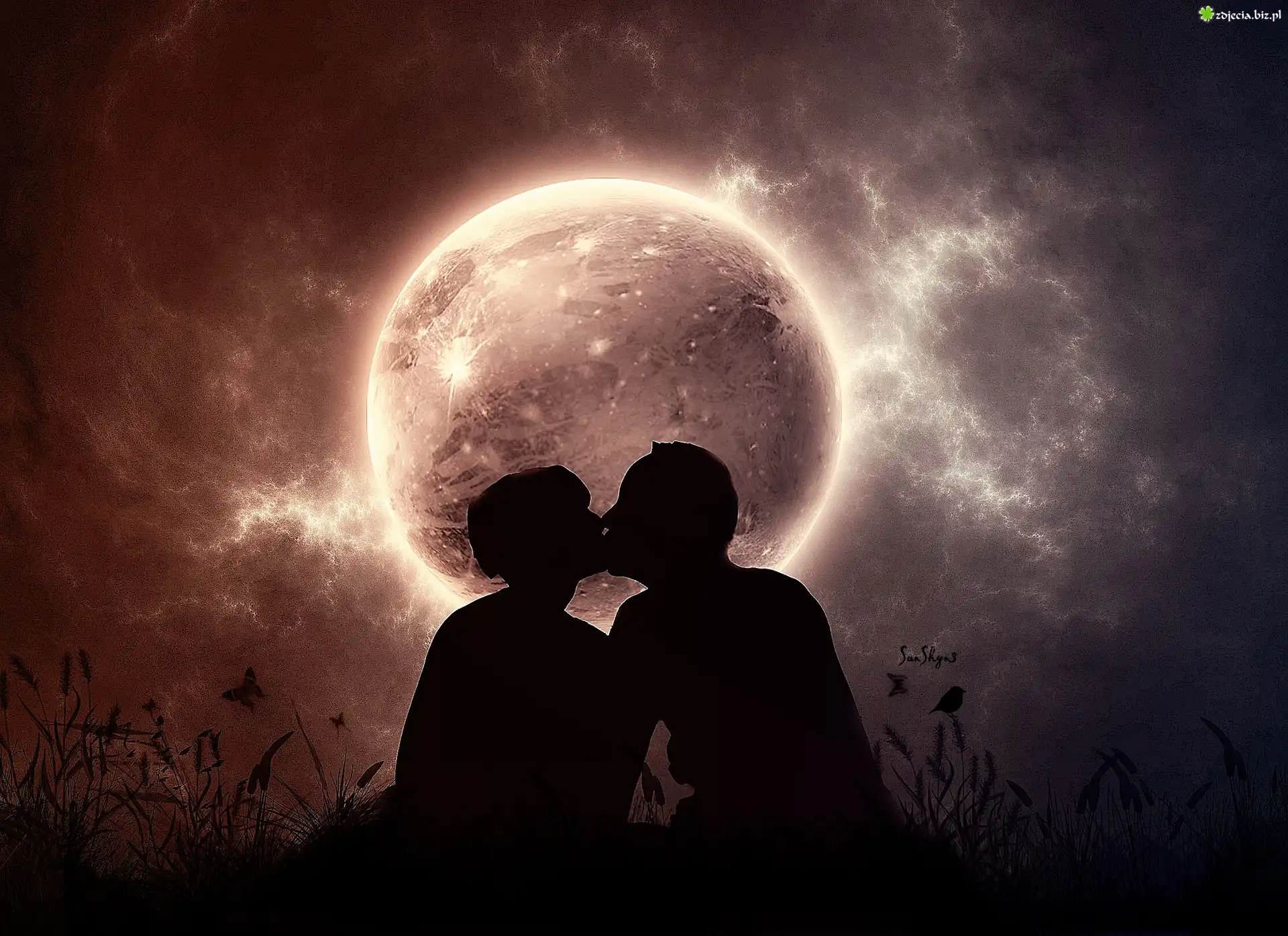 Zdjęcie Noc, Księżyc, Para, Zakochanych, Pocałunek