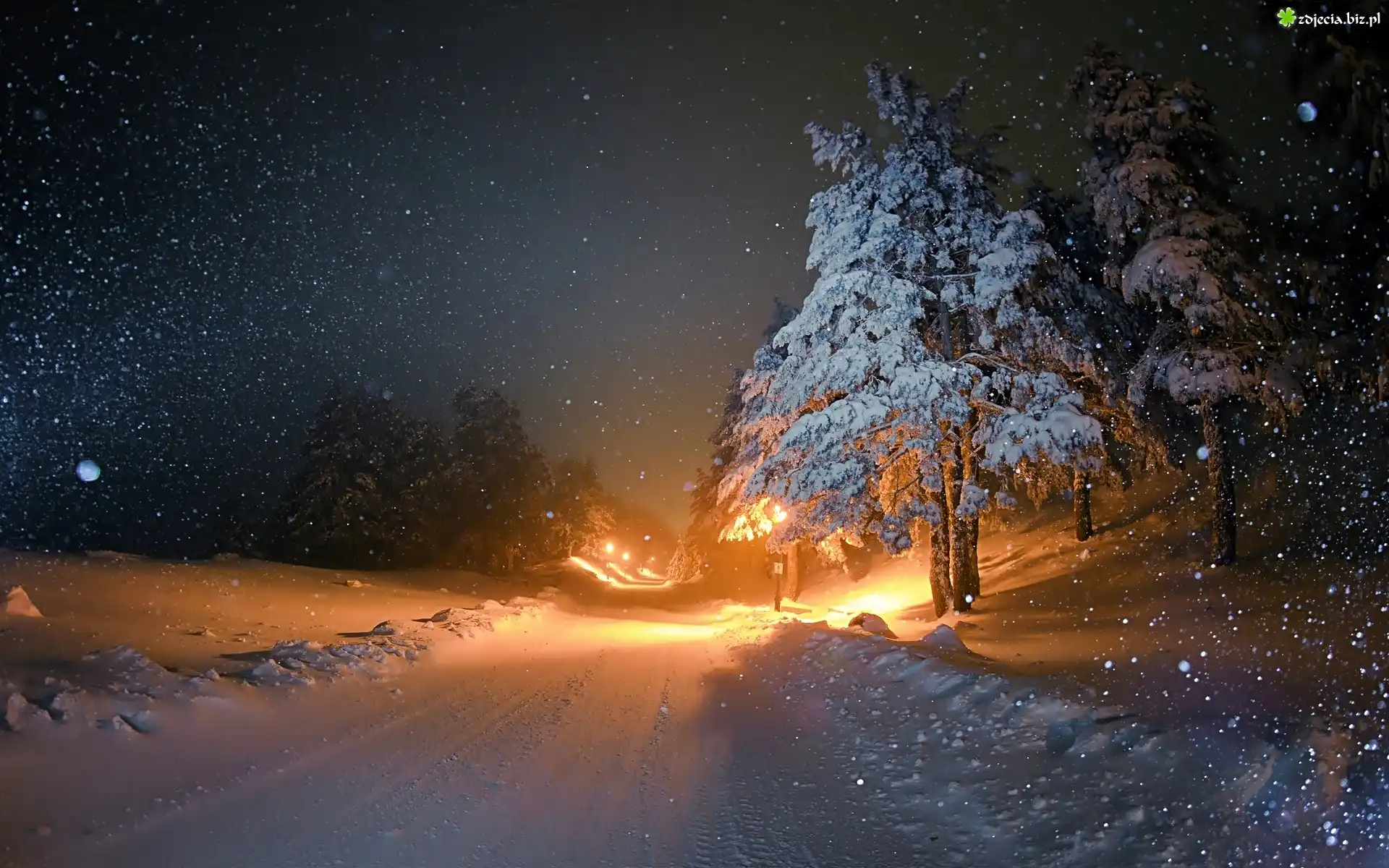 Zdjęcie Zima, Noc, Droga, Drzewa, Padający, Śnieg, Oświetlenie