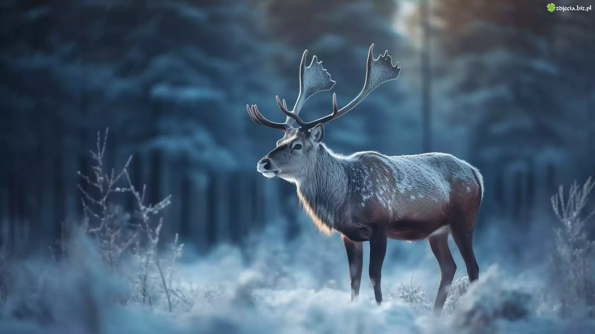 Zdjęcie, Jeleń, Noc, Zima, Rośliny, Śnieg