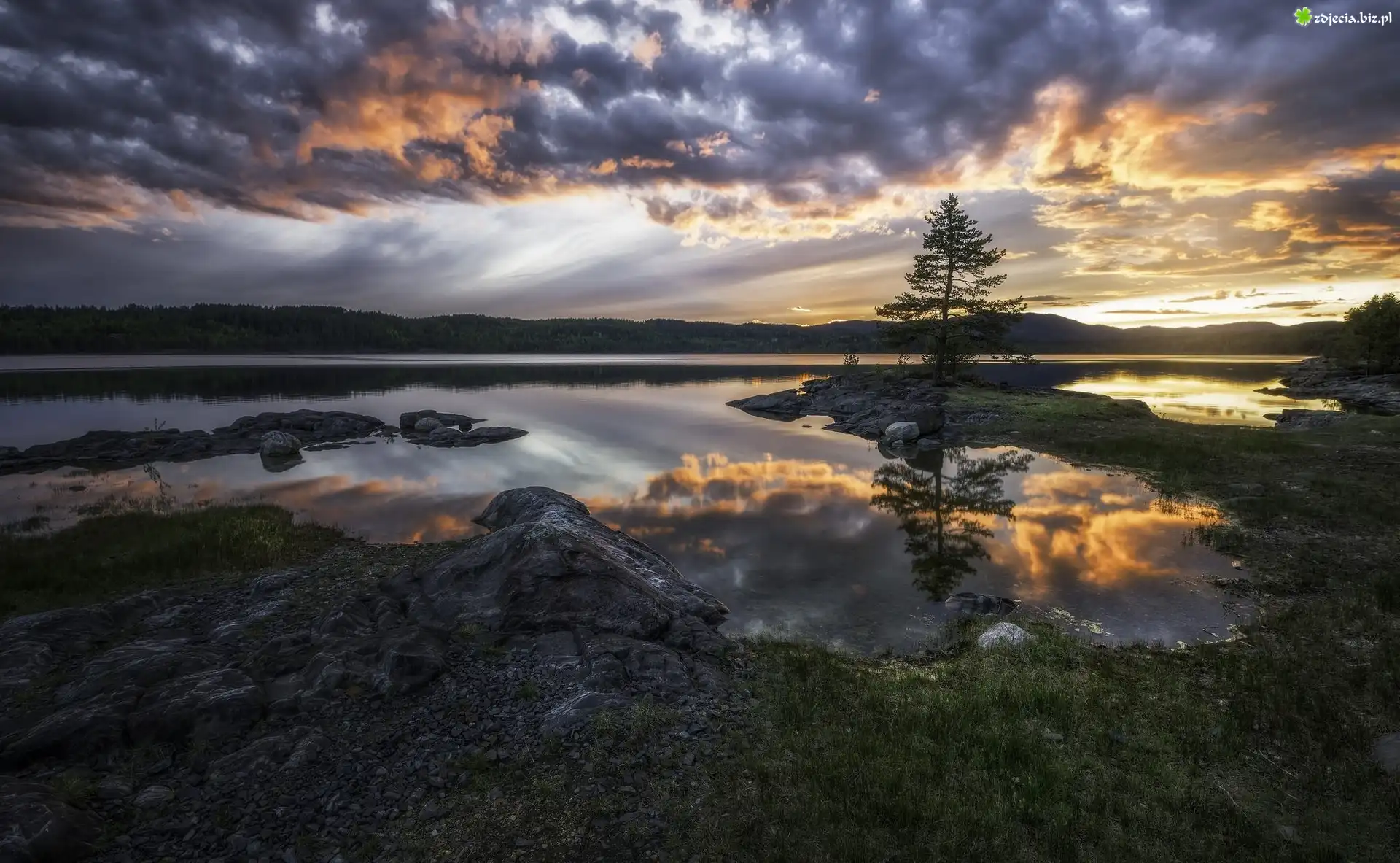 Zdjęcie Norwegia, Jezioro, Drzewo, Niebo, Chmury, Odbicie
