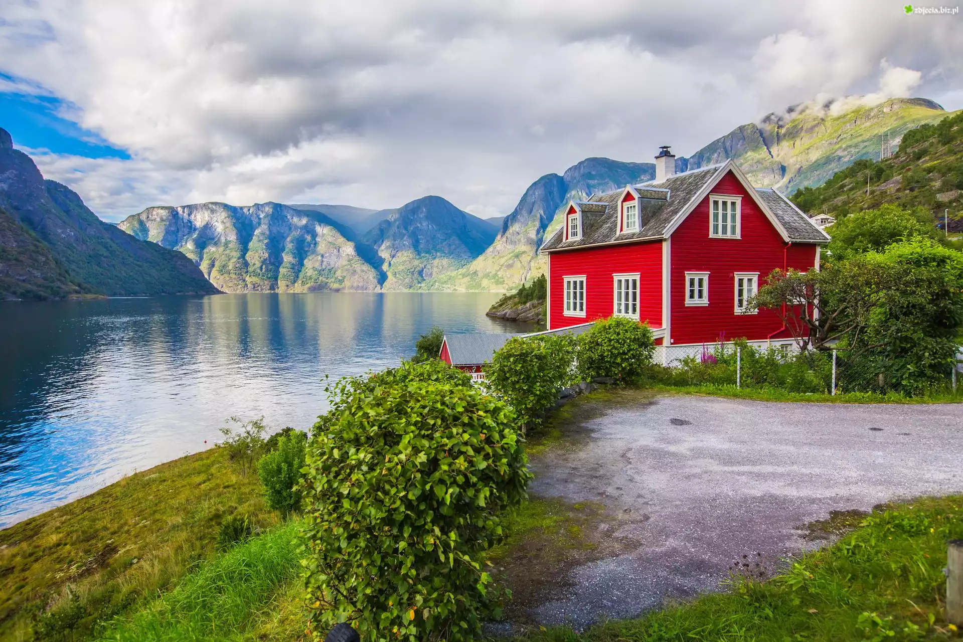 Zdjęcie, Norwegia, Fiord Sognefjorden, Góry, Czerwony, Dom