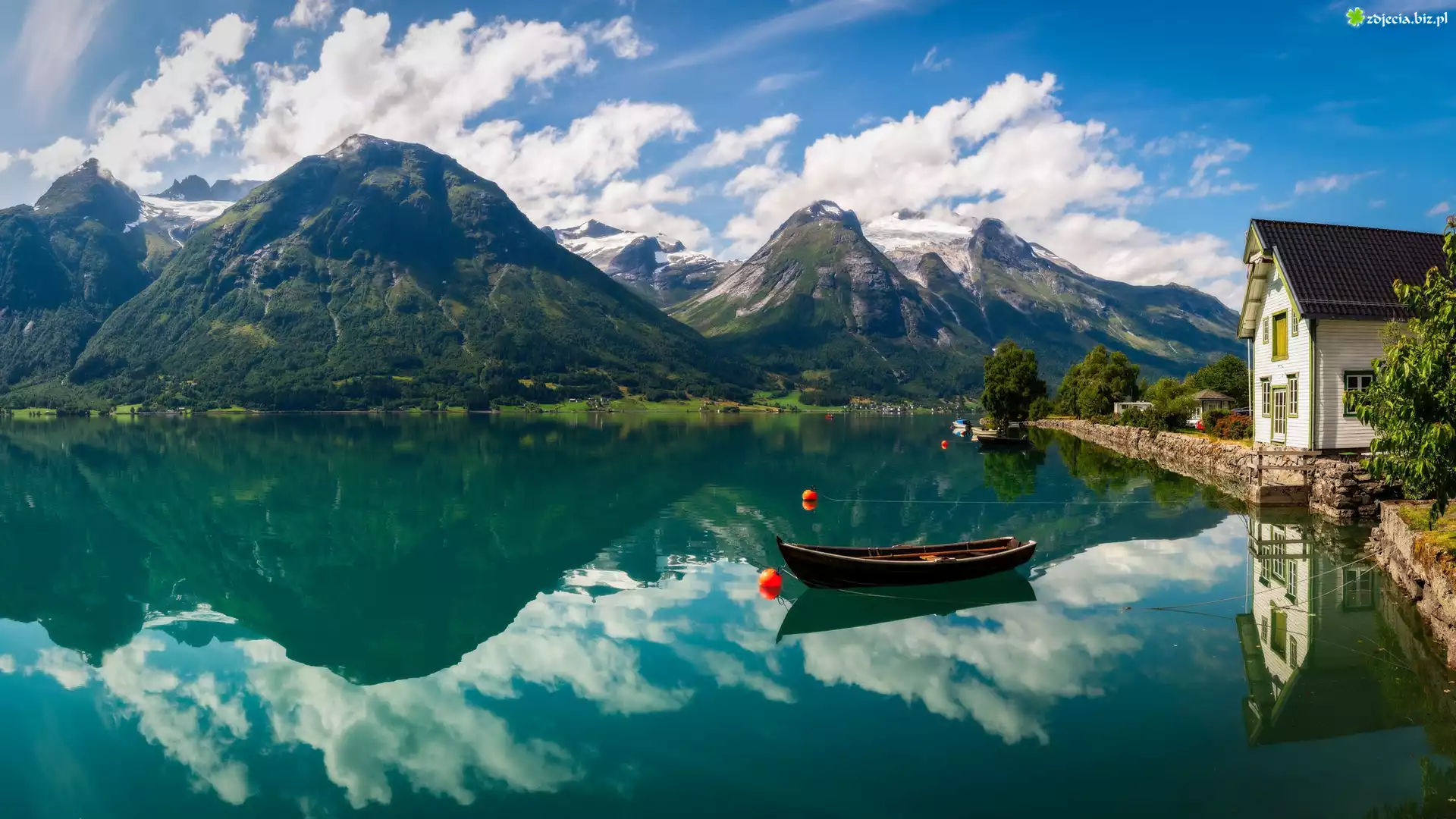 Zdjęcie Norwegia, Sogn og Fjordane, Wieś Hjelle, Jezioro Oppstrynsvatnet, Góry, Domy, Łódka, Chmury, Odbicie |