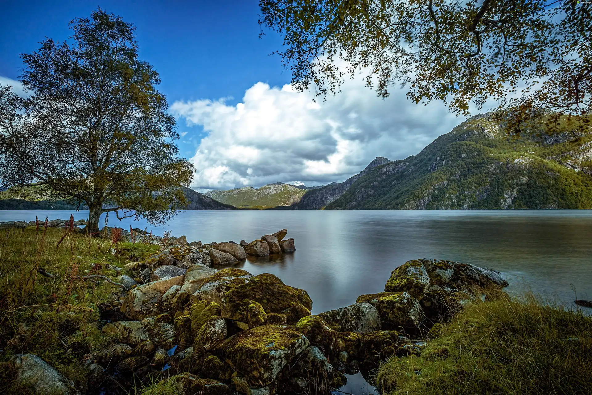 Zdjęcie, Norwegia, Jezioro, Góry, Kamienie, Drzewa