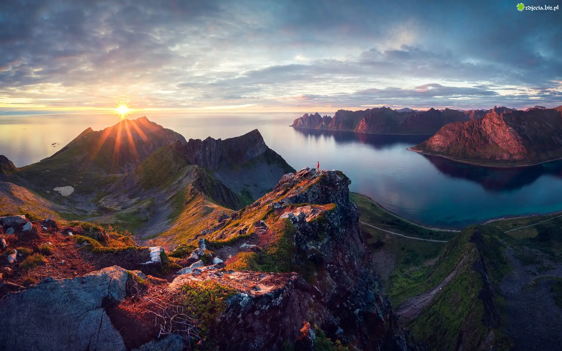 Zdjęcie, Norwegia, Wyspa Senja, Góry, Szczyt Husfjellet, Mgła, Postać, Morze