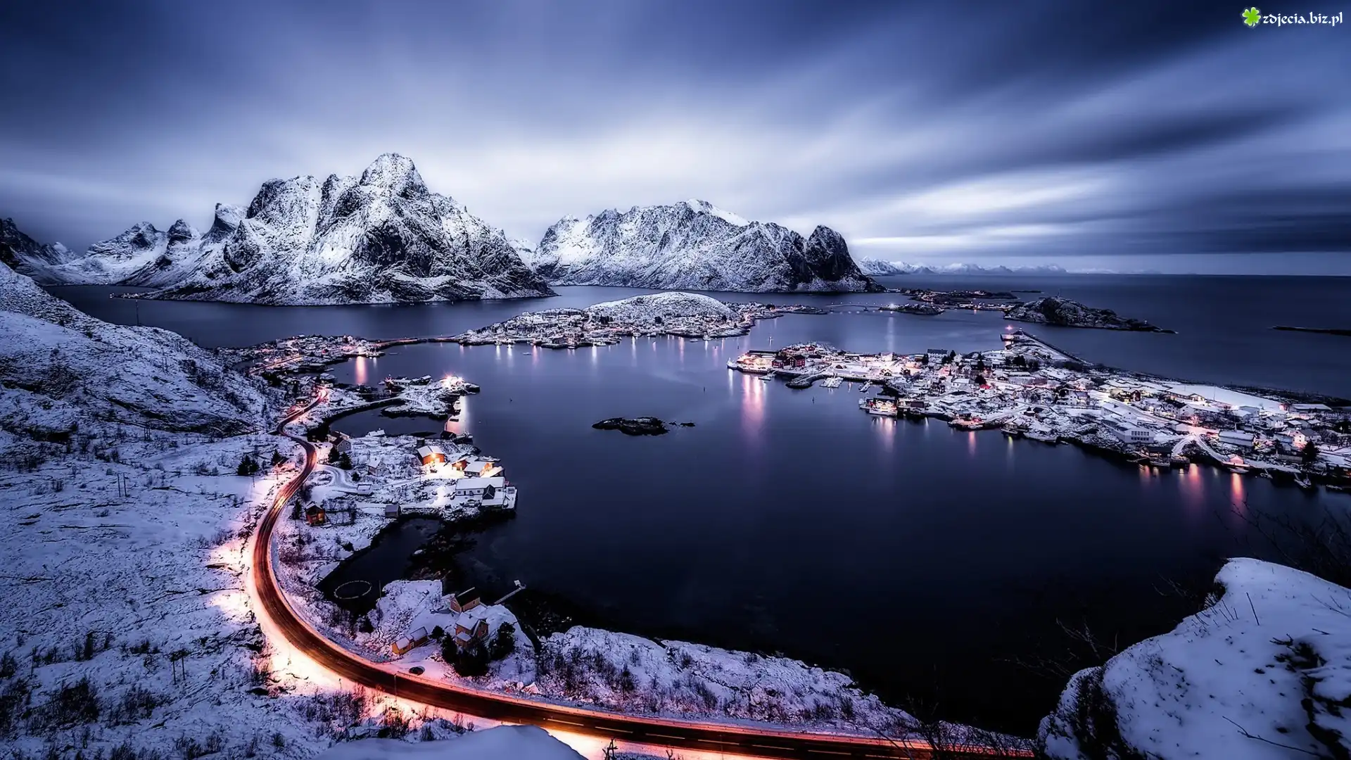 Zdjęcie Norwegia, Lofoty, Wyspa Moskenesøya, Wioska Reine, Zima, Droga, Góry, Morze, Skały