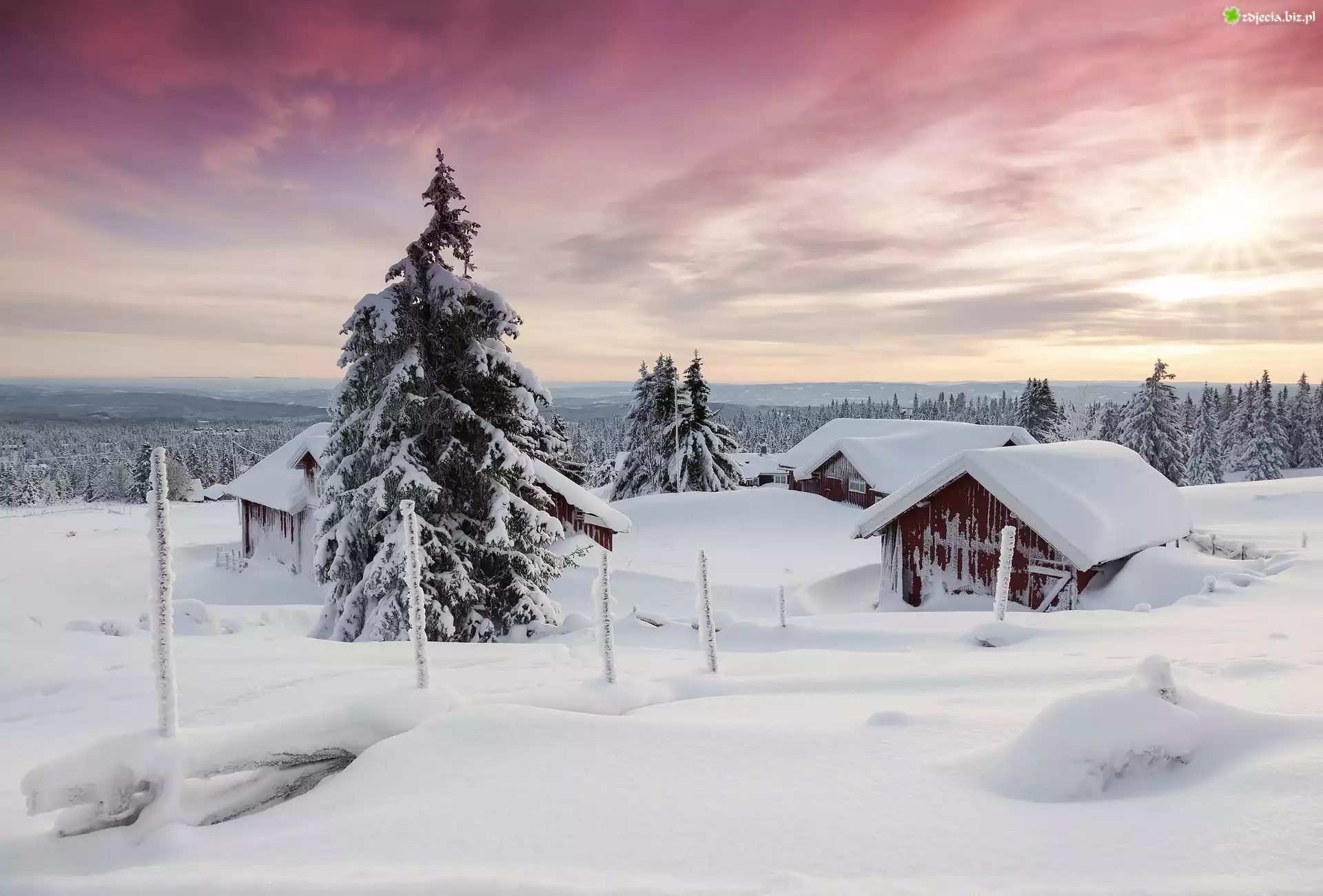 Zdjęcie Zima, Domy, Drzewa, Śnieg, Promienie słońca, Sjusjoen, Okręg Hedmark, Norwegia