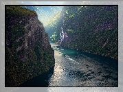 Zdjęcie Skały, Wodospad, Skjervsfossen Waterfall, Rzeka, Rośliny, Chmury, Drzewa, Granvin, Norwegia |