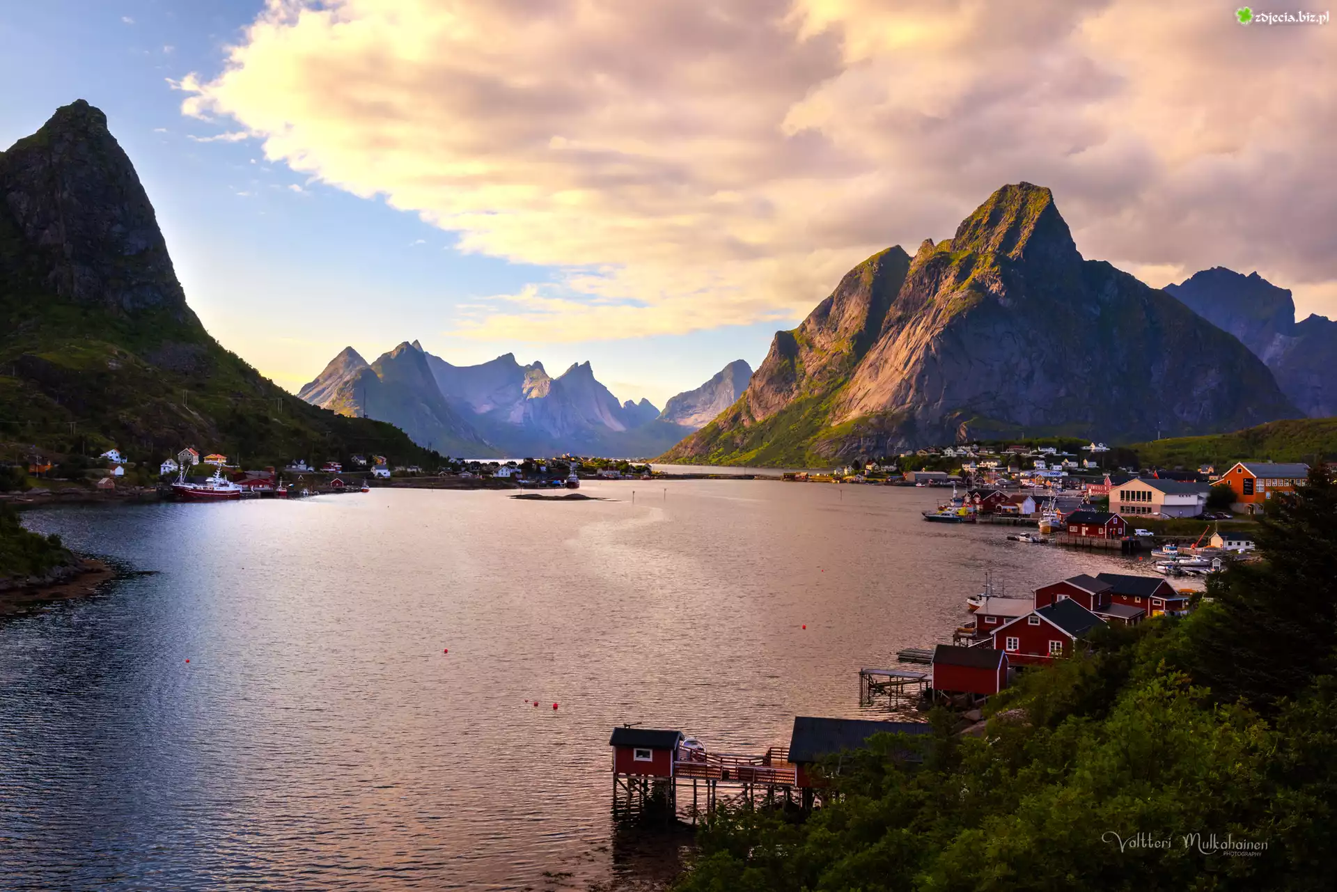 Zdjęcie Norwegia, Lofoty, Góry, Wioska, Reine, Domy, Morze, Wschód Słońca, Roślinność