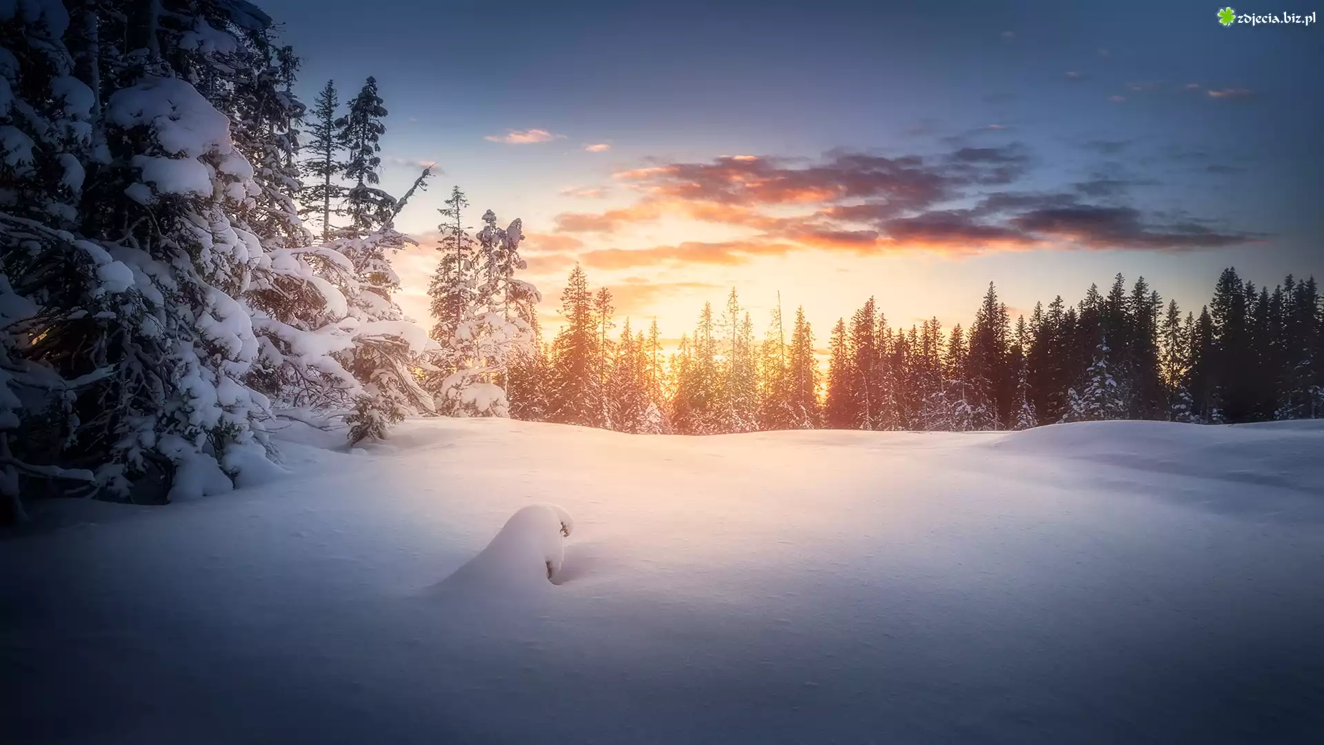 Zdjęcie Norwegia, Region Sør-Trøndelag, Miasto Trondheim, Bymarka, Zachód Słońca, Zima, Las, Drzewa, Chmury |