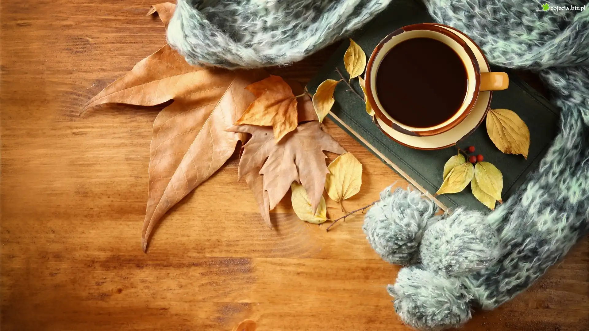 Zdjęcie Notes, Szalik, Liście, Filiżanka, Kawa