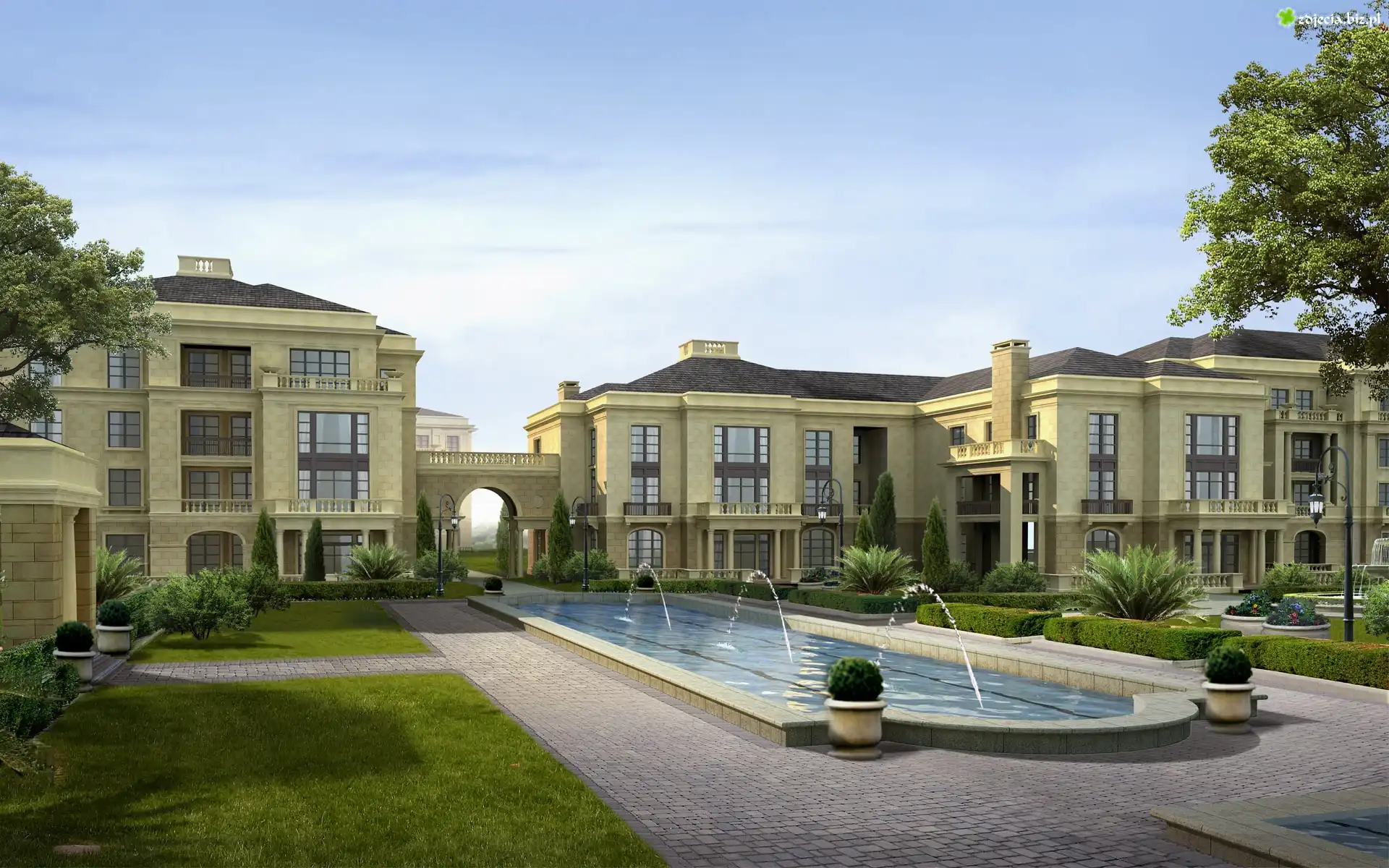 Zdjęcie, Nowoczesne, Osiedle, Domy, Fontanna