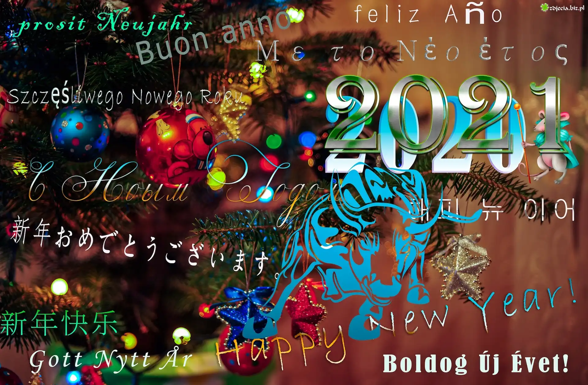 Zdjęcie Noworoczna, Kartka, Napisy, Życzenia, Choinka, Bombki