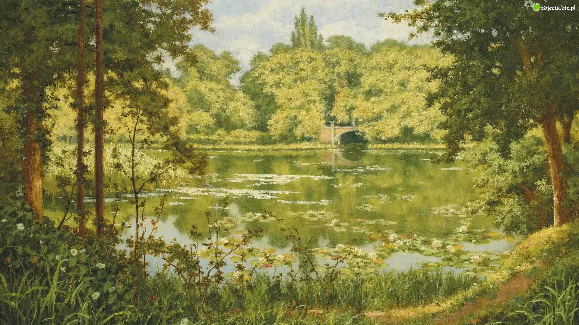 Zdjęcie Malarstwo, Obraz, Henri Biva, Drzewa, Jezioro, Most