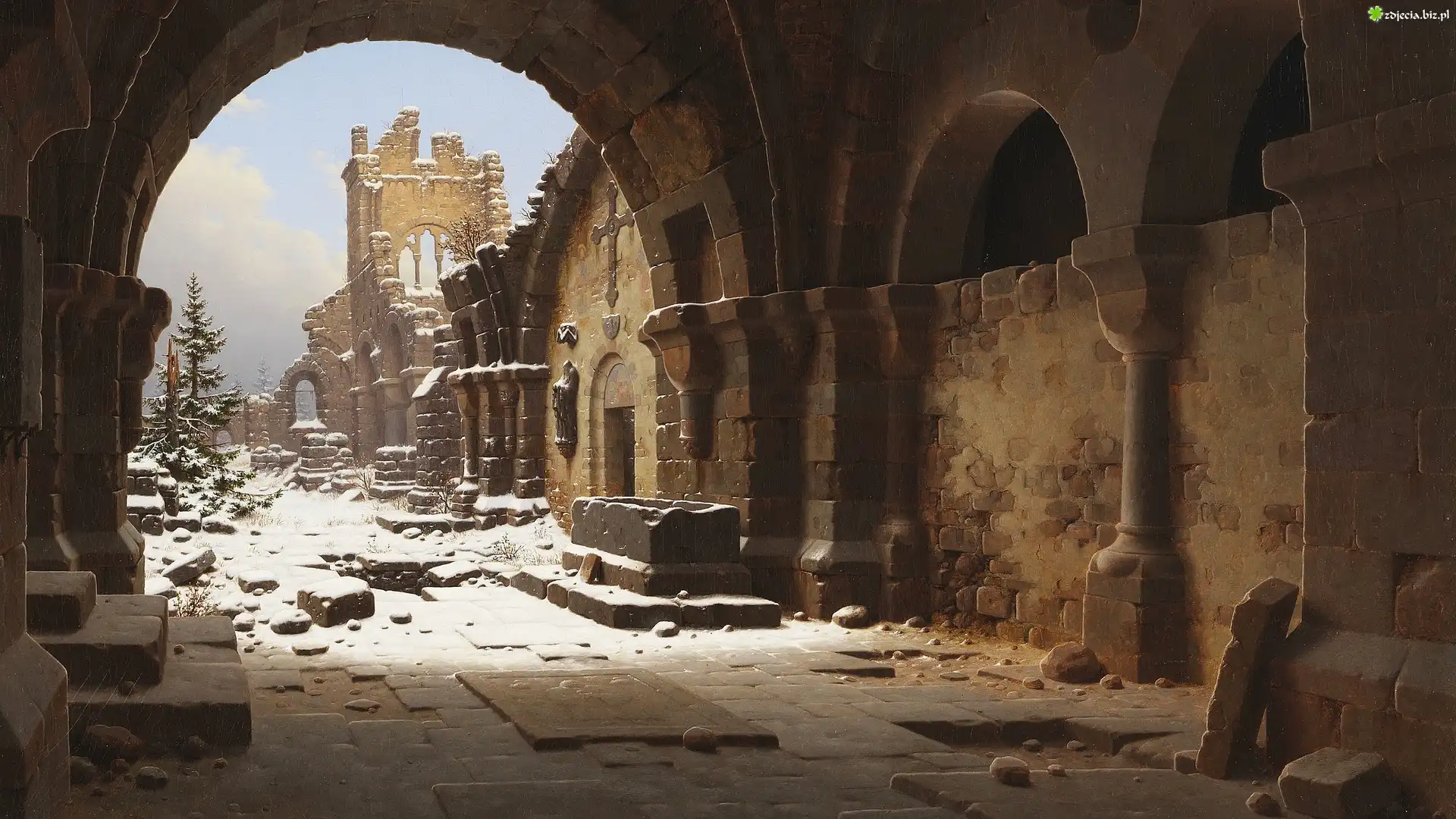 Zdjęcie Malarstwo, Obraz, Carl Hasenpflug, Kościół, Ruiny, Zima