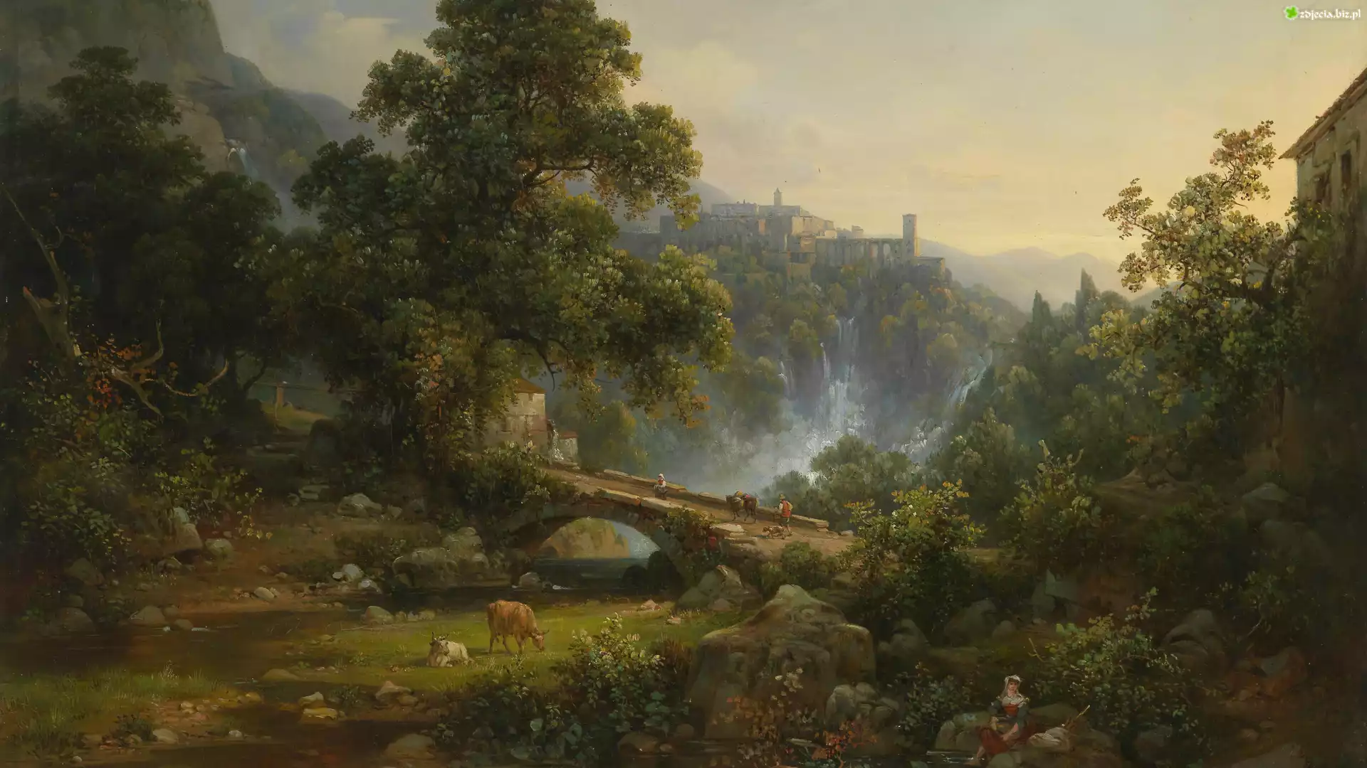 Zdjęcie Drzewa, Skały, Wieś, Most, Rzeka, Ludzie, Krowy, Malarstwo, Obraz