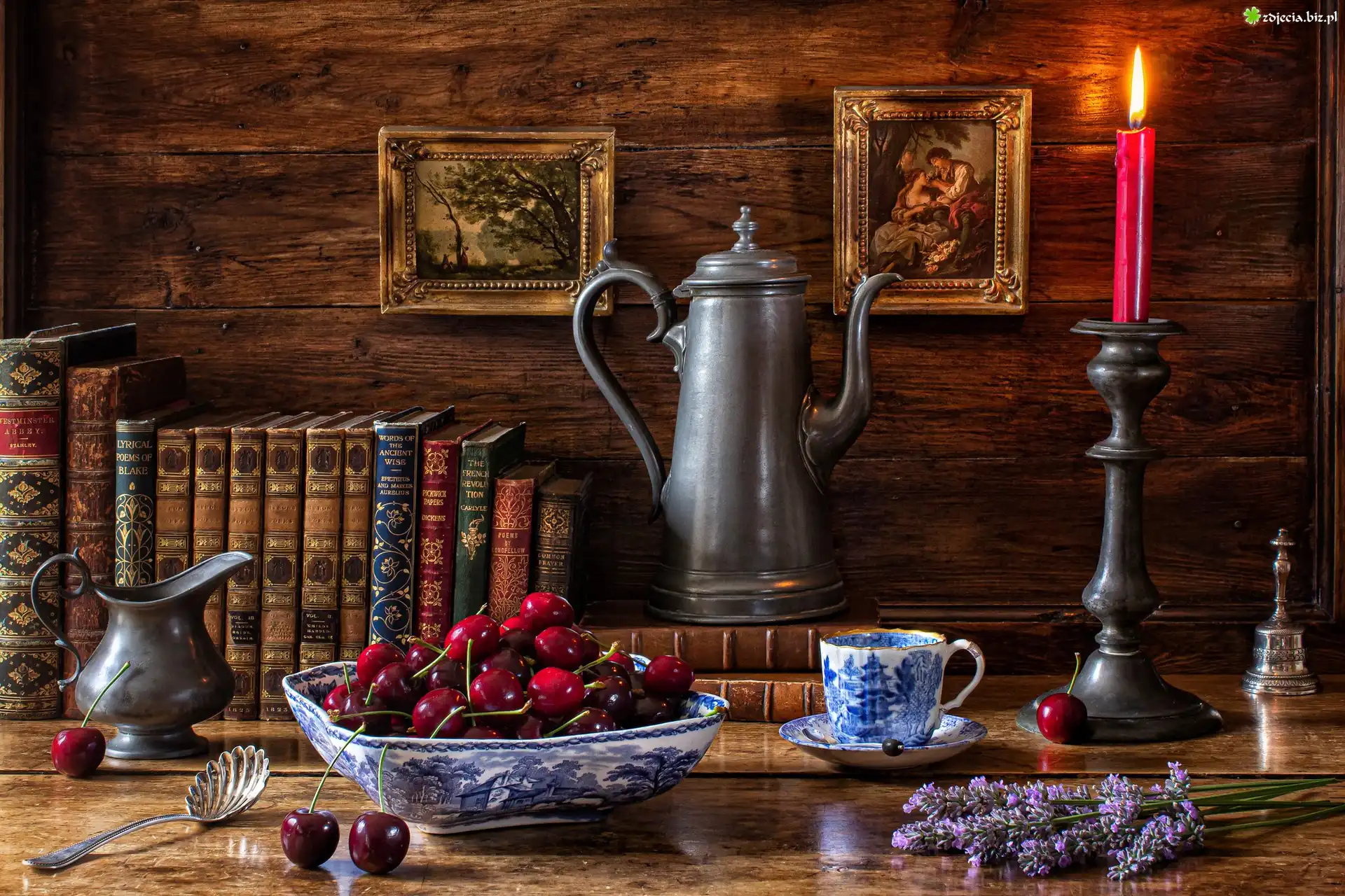 Zdjęcie Kompozycja, Książki, Obrazy, Dzbanek, Świecznik, Świeca, Dzwonek, Lawenda, Półmisek, Czereśnie, Filiżanka |