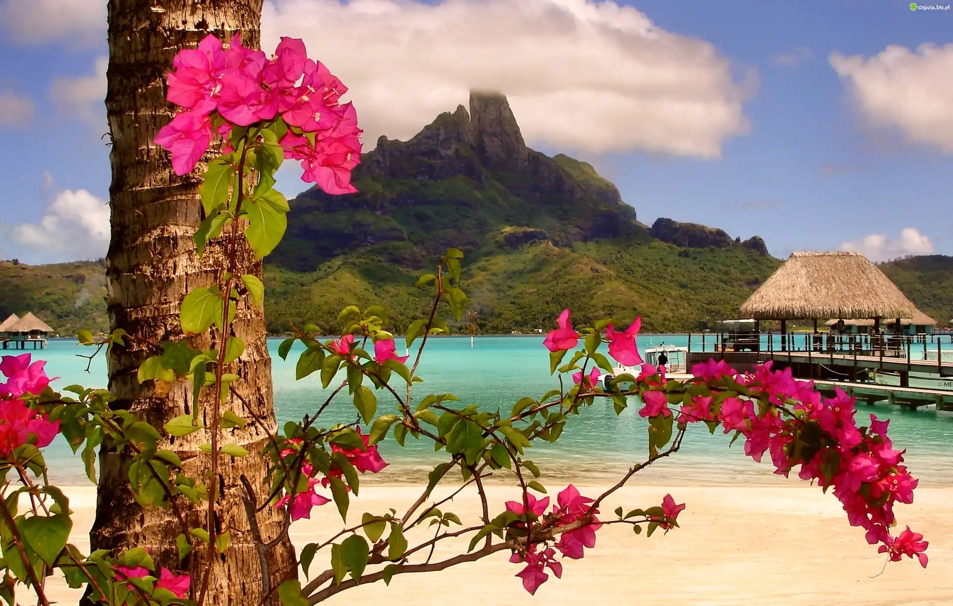 Zdjęcie, Ocean, Plaża, Góry, Bugenwilla, Bor Bora