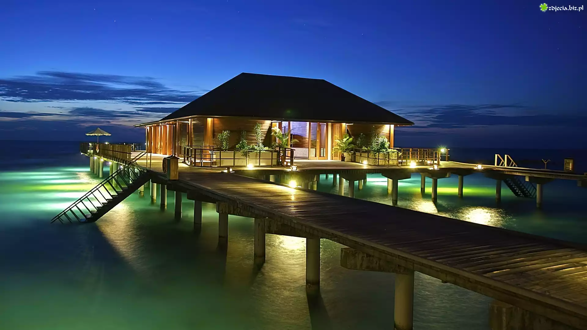 Zdjęcie Ocean, Pomost, Oświetlony, Dom
