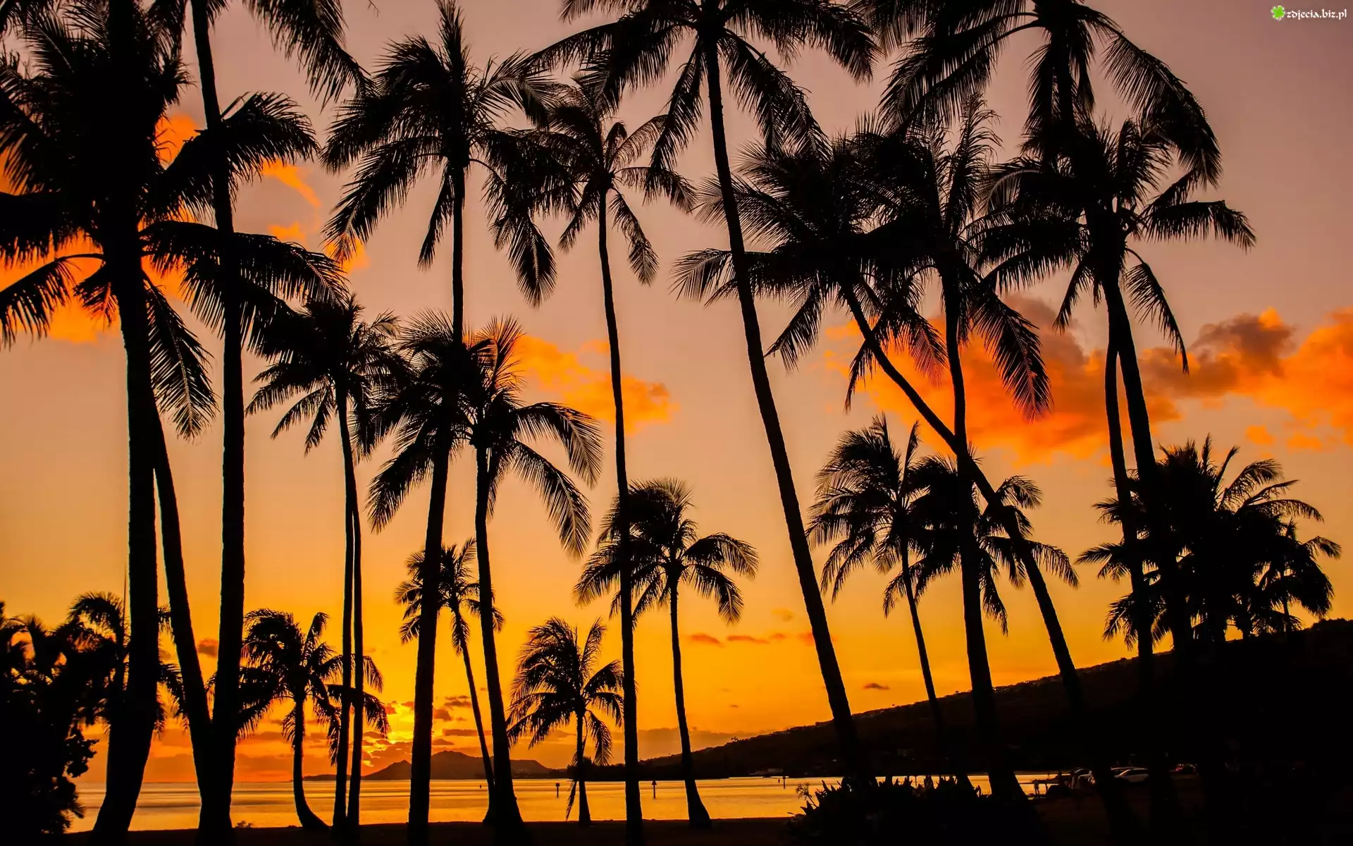 Zdjęcie Palmy, Ocean, Zachód, Słońca, Wyspa, Hawaje, USA
