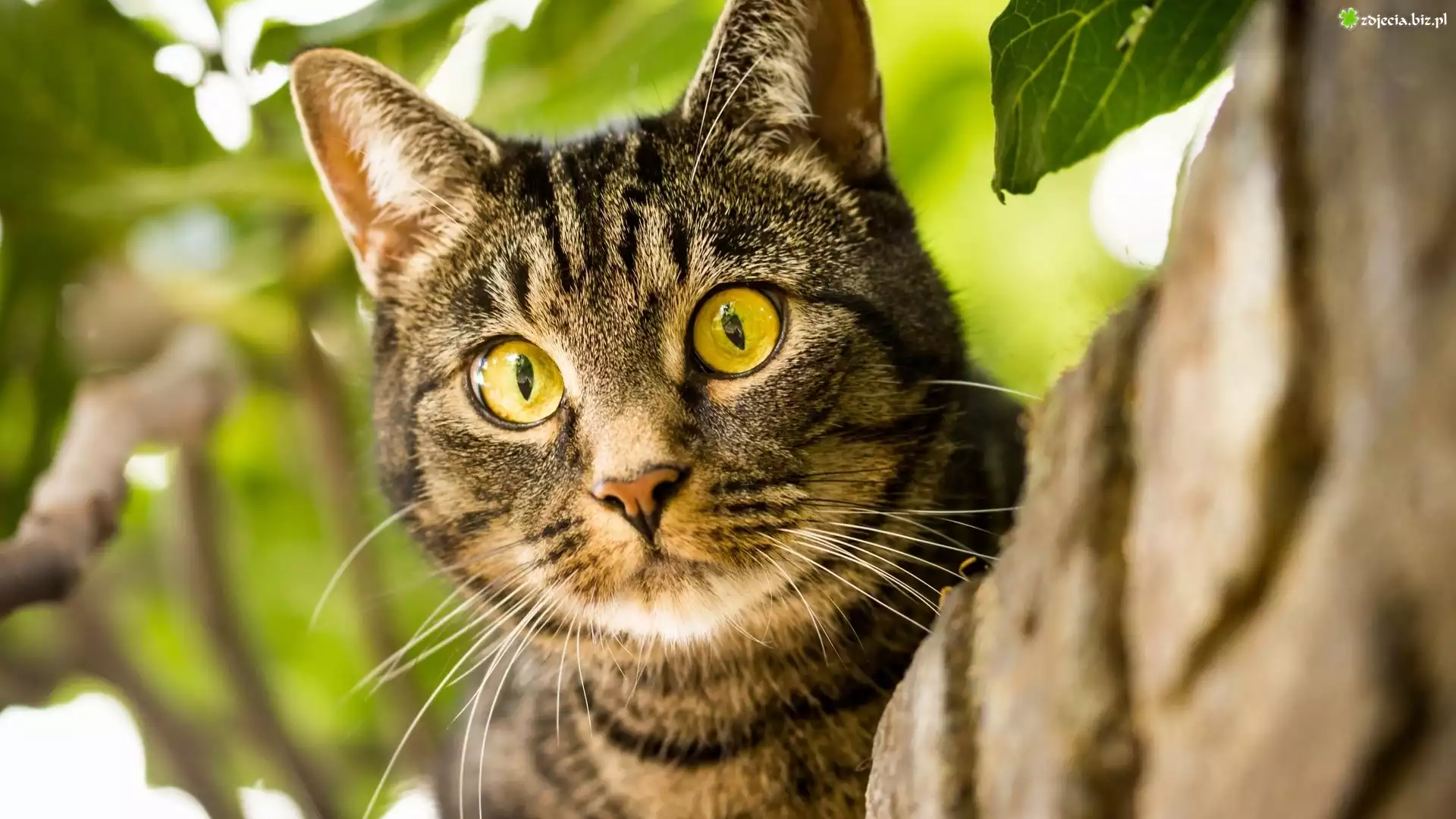 Zdjęcie Pręgowany, Kot, Żółte oczy, Drzewo, Liście