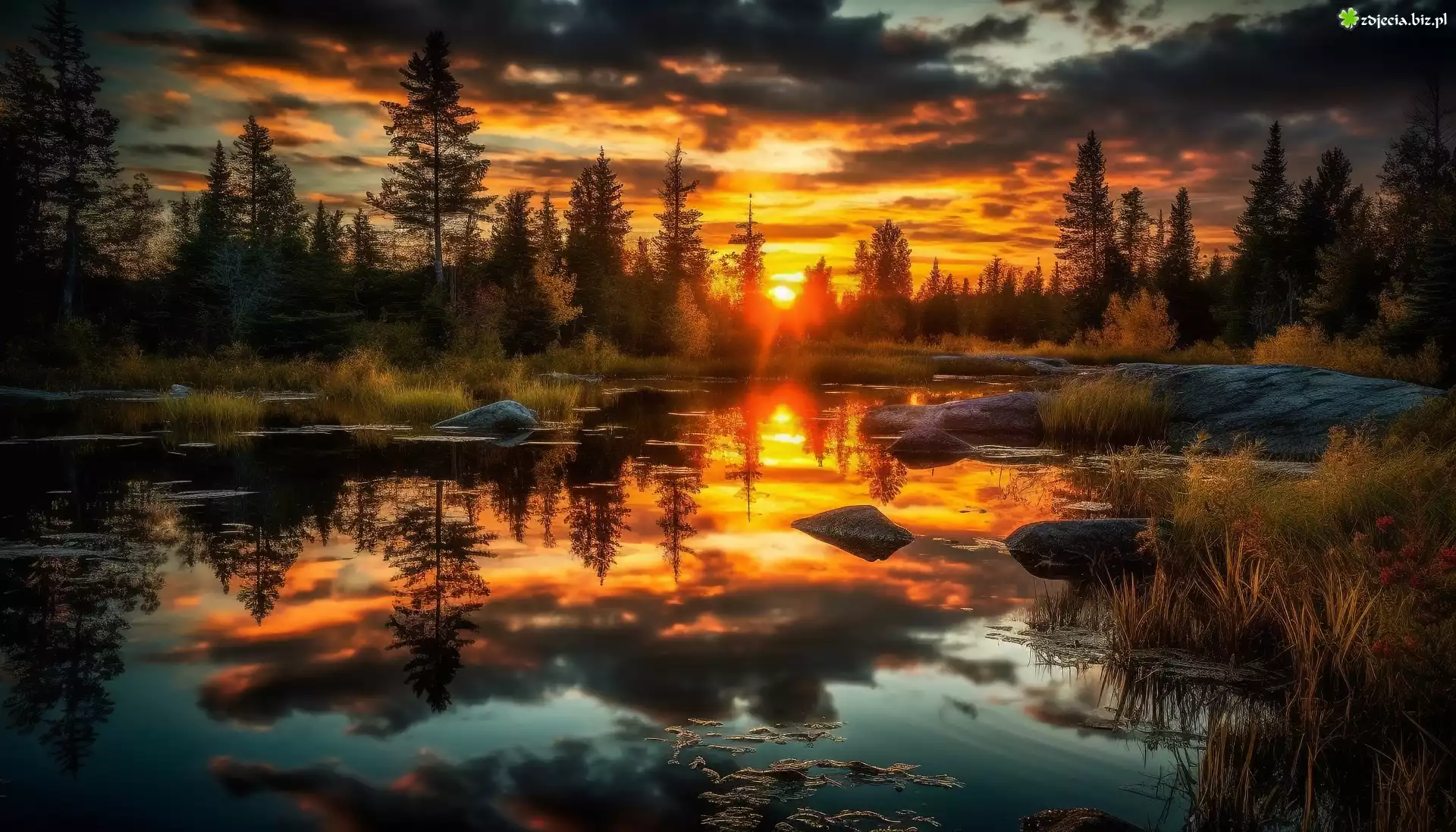 Zdjęcie Jezioro, Odbicie, Drzewa, Zachód słońca