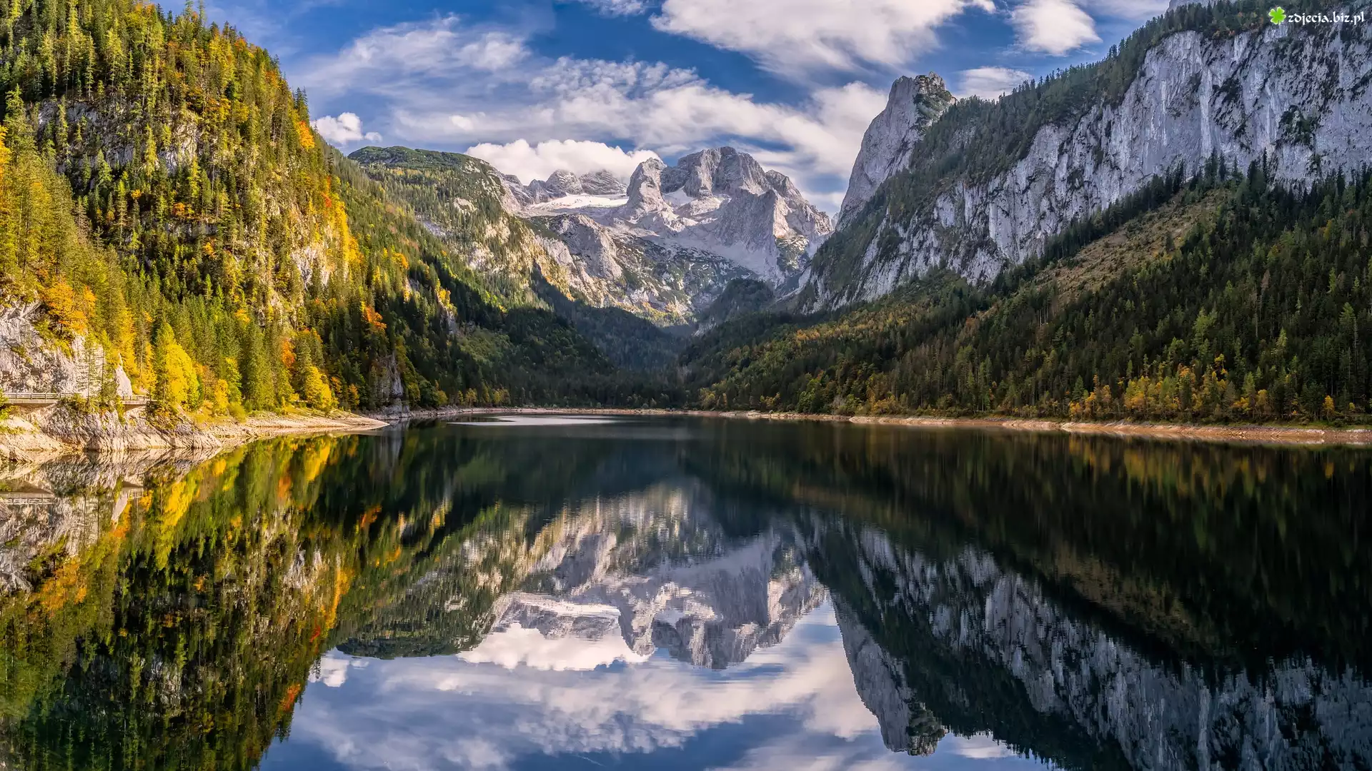 Zdjęcie Austria, Salzkammergut, Góry, Alpy, Jezioro Gosausee, Lasy, Odbicie