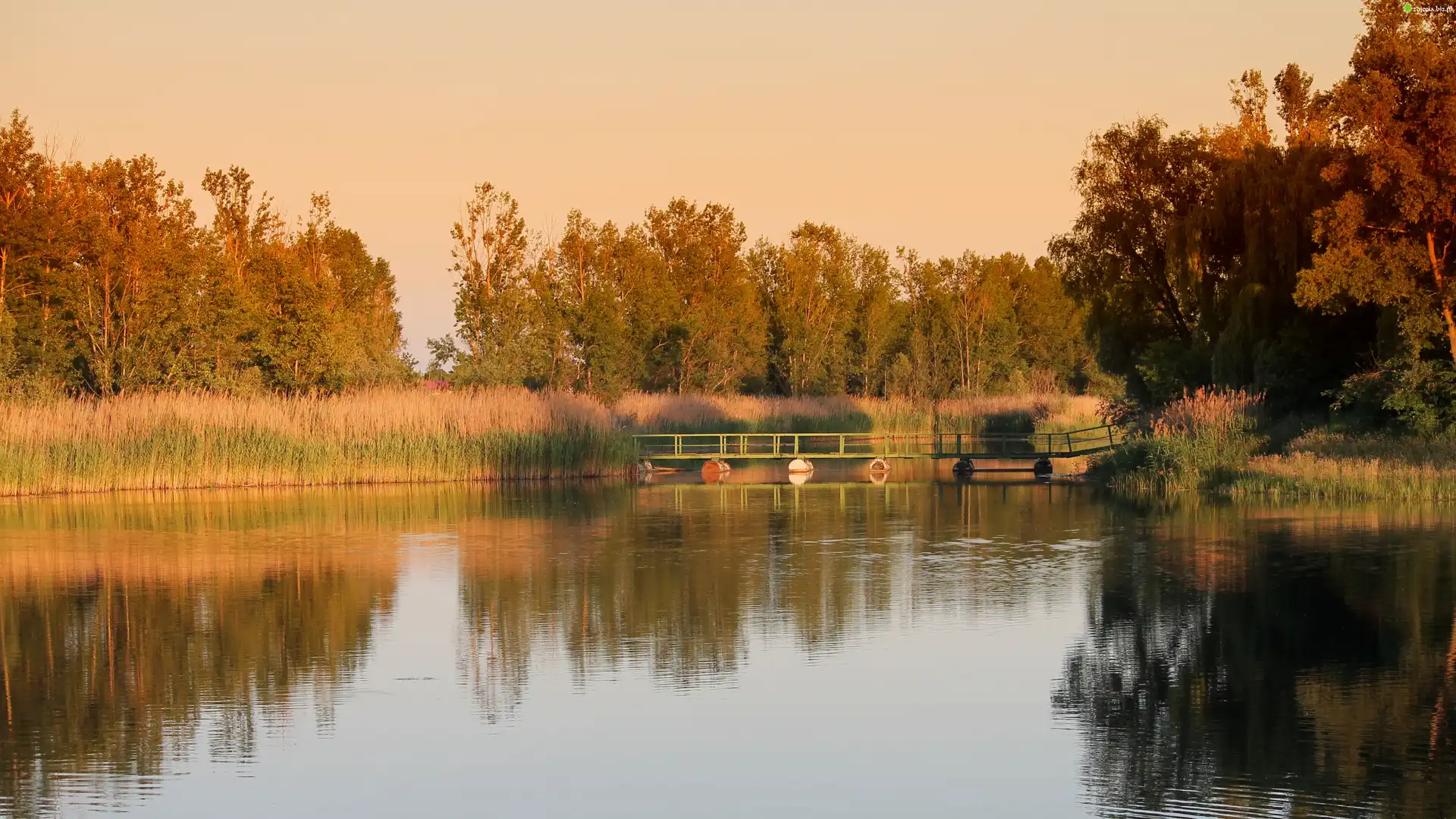 Zdjęcie, Jezioro, Odbicie, Trzciny, Drzewa, Zachód, Słońca, Jesień