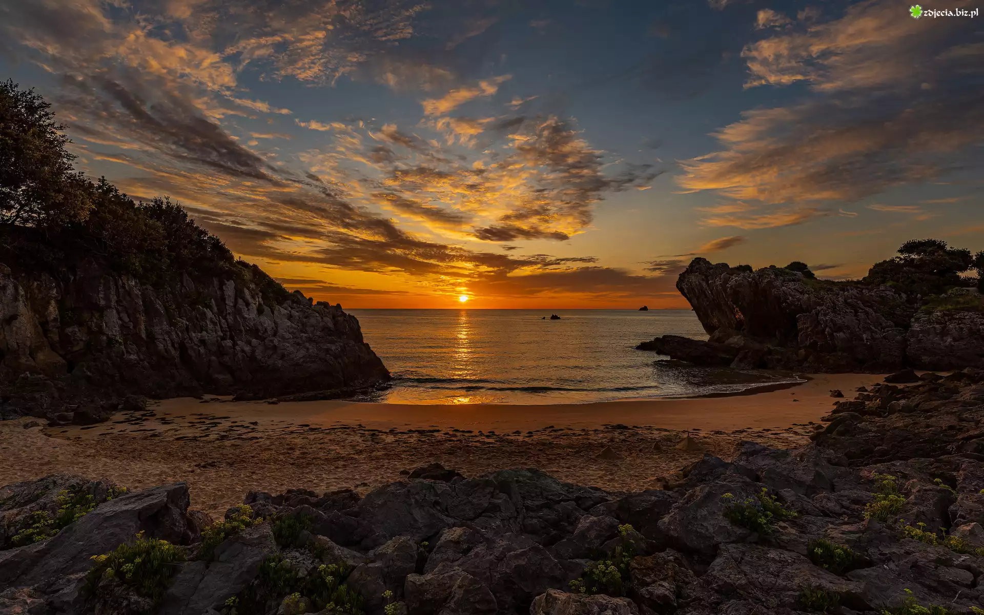 Zdjęcie Morze, Plaża, Piasek, Skały, Kamienie, Drzewa, Chmury, Zachód słońca, Odbicie