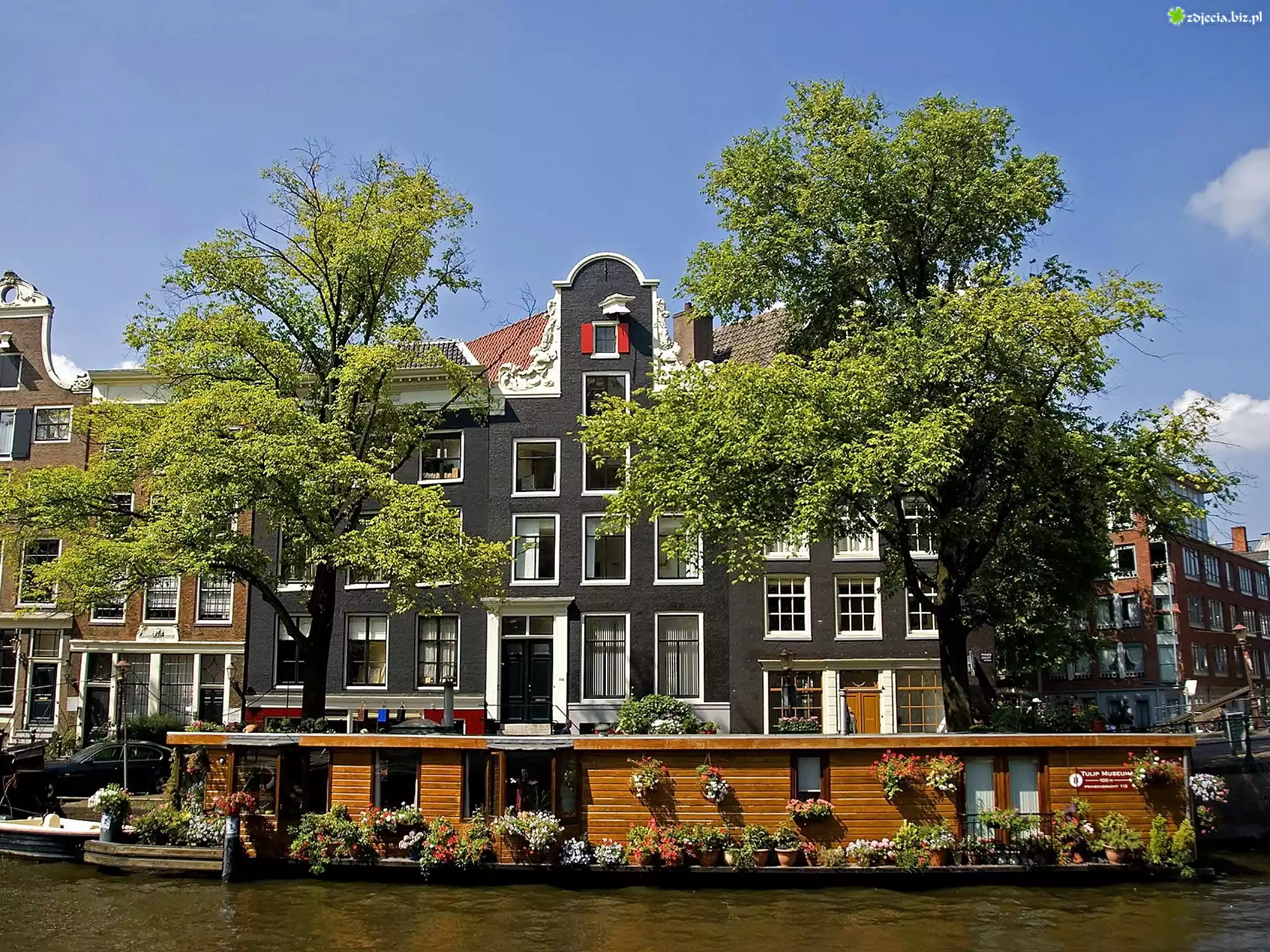 Zdjęcie Lato, Fragment, Amsterdamu, Kamienice, Roślinność, Kanał, Dom, Na Wodzie, Łódka